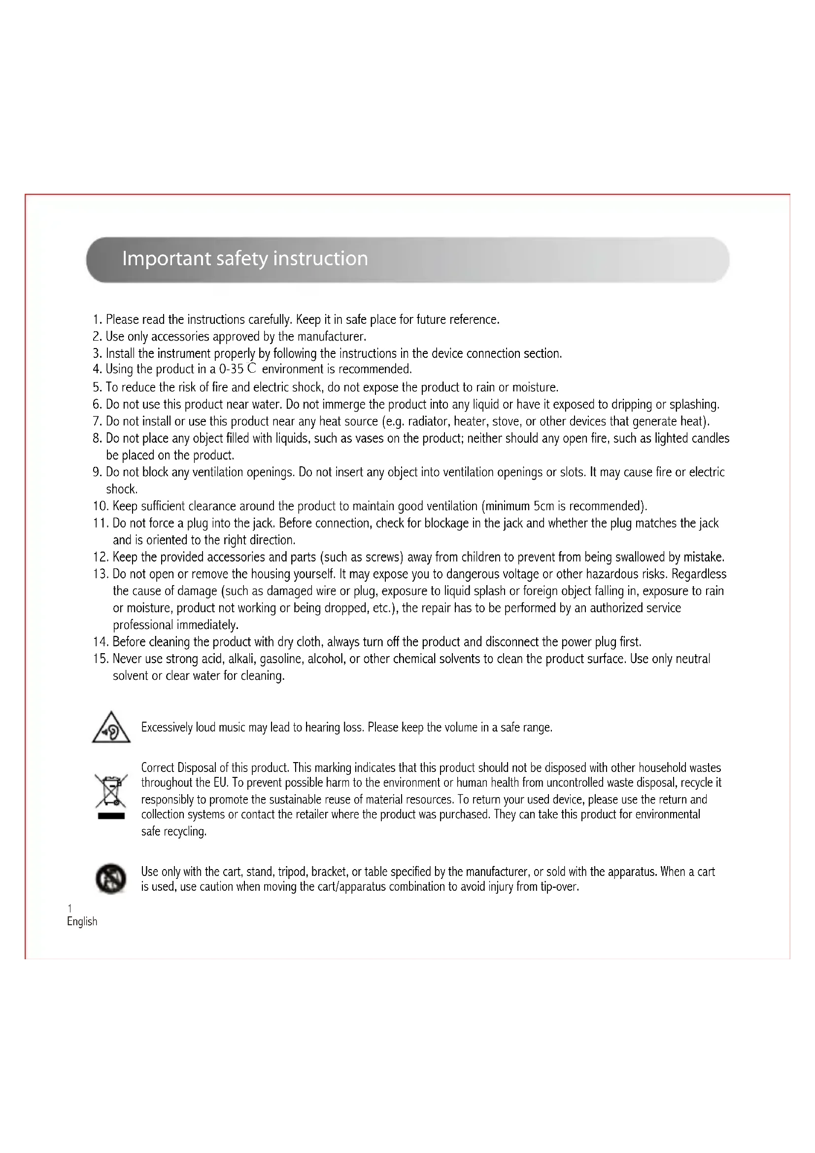 15. Never use strong acid, alkali, gasoline, alcohol, or other chemical solvents to clean the product surface. Use only neutral solvent or clear water for cleaning.2 English Important safety instruction This symbol is to alert the user to the presence of un-insulated dangerous voltage within the product's enclosure that may be of sufficient magnitude to constitute a risk of electric shock to persons. This symbol is to warn the user not to disassemble the enclosure of the product and there is no user-replaceable part inside. Take the product to an authorized service center for repair. This symbol indicates that the product is for indoor use only. This symbol indicates that the product is a CLASS II or double insulated electrical device with no earth requirement. Power warning: