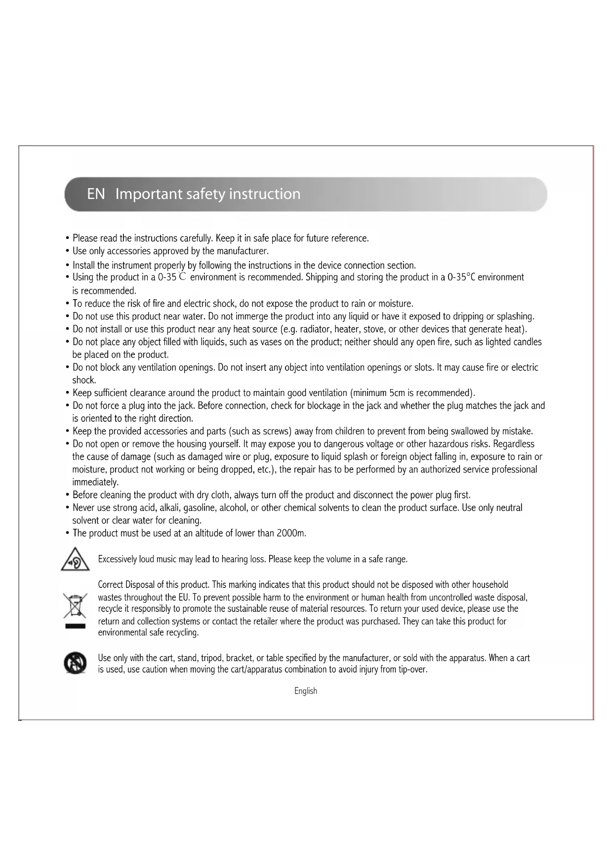R2750DB Multimedia Speaker ManualEnglish EN Important safety instruction Excessively loud music may lead to hearing loss. Please keep the volume in a safe range. Correct Disposal of this product. This marking indicates that this product should not be disposed with other household wastes throughout the EU. To prevent possible harm to the environment or human health from uncontrolled waste disposal, recycle it responsibly to promote the sustainable reuse of material resources. To return your used device, please use the return and collection systems or contact the retailer where the product was purchased. They can take this product for environmental safe recycling. Use only with the cart, stand, tripod, bracket, or table specified by the manufacturer, or sold with the apparatus. When a cart is used, use caution when moving the cart/apparatus combination to avoid injury from tip-over.