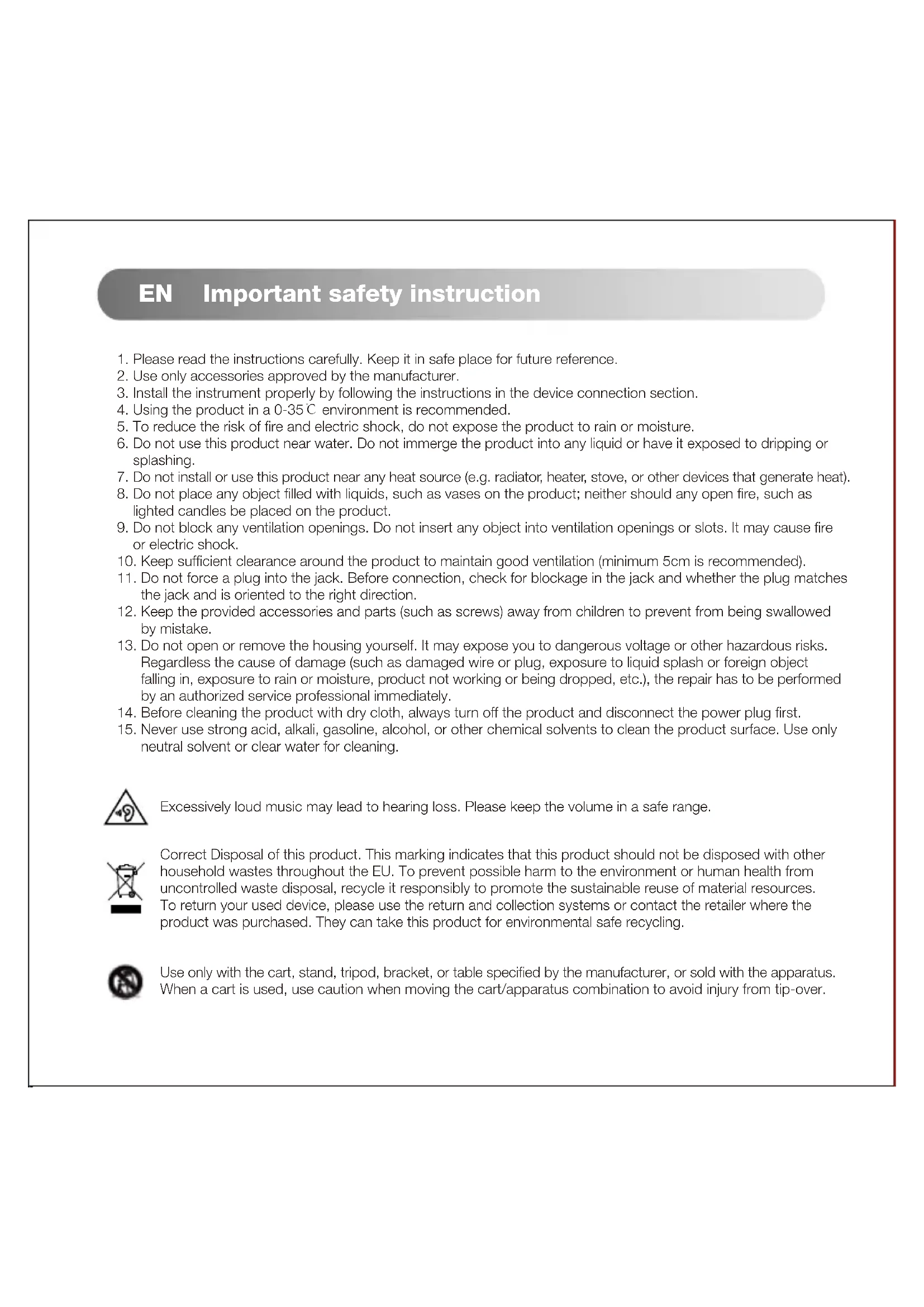 neutral solvent or clear water for cleaning. Excessively loud music may lead to hearing loss. Please keep the volume in a safe range. Correct Disposal of this product. This marking indicates that this product should not be disposed with other household wastes throughout the EU. To prevent possible harm to the environment or human health from uncontrolled waste disposal, recycle it responsibly to promote the sustainable reuse of material resources. To return your used device, please use the return and collection systems or contact the retailer where the product was purchased. They can take this product for environmental safe recycling. Use only with the cart, stand, tripod, bracket, or table specified by the manufacturer, or sold with the apparatus. When a cart is used, use caution when moving the cart/apparatus combination to avoid injury from tip-over.Important safety instruction This symbol indicates that the product is for indoor use only. This symbol indicates that the product is a CLASS II or double insulated electrical device with no earth requirement. Power warning: