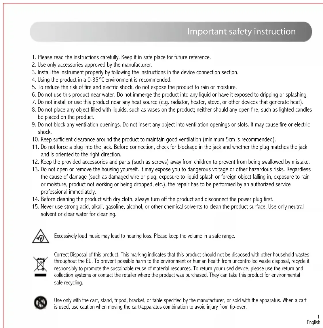 R1280Ts1 English Important safety instruction Excessively loud music may lead to hearing loss. Please keep the volume in a safe range. Correct Disposal of this product. This marking indicates that this product should not be disposed with other household wastes throughout the EU. To prevent possible harm to the environment or human health from uncontrolled waste disposal, recycle it responsibly to promote the sustainable reuse of material resources. To return your used device, please use the return and collection systems or contact the retailer where the product was purchased. They can take this product for environmental safe recycling. Use only with the cart, stand, tripod, bracket, or table specified by the manufacturer, or sold with the apparatus. When a cart is used, use caution when moving the cart/apparatus combination to avoid injury from tip-over.