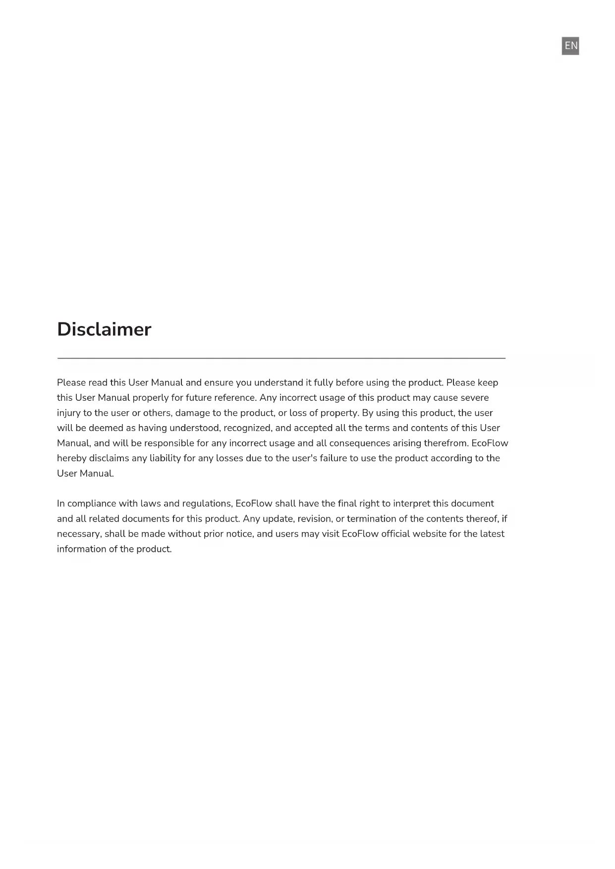 LFP Battery User ManualEN Please read this User Manual and ensure you understand it fully before using the product. Please keep this User Manual properly for future reference. Any incorrect usage of this product may cause severe injury to the user or others, damage to the product, or loss of property. By using this product, the user will be deemed as having understood, recognized, and accepted all the terms and contents of this User Manual, and will be responsible for any incorrect usage and all consequences arising therefrom. EcoFlow hereby disclaims any liability for any losses due to the user's failure to use the product according to the User Manual. In compliance with laws and regulations, EcoFlow shall have the final right to interpret this document and all related documents for this product. Any update, revision, or termination of the contents thereof, if necessary, shall be made without prior notice, and users may visit EcoFlow official website for the latest information of the product. Disclaimer1