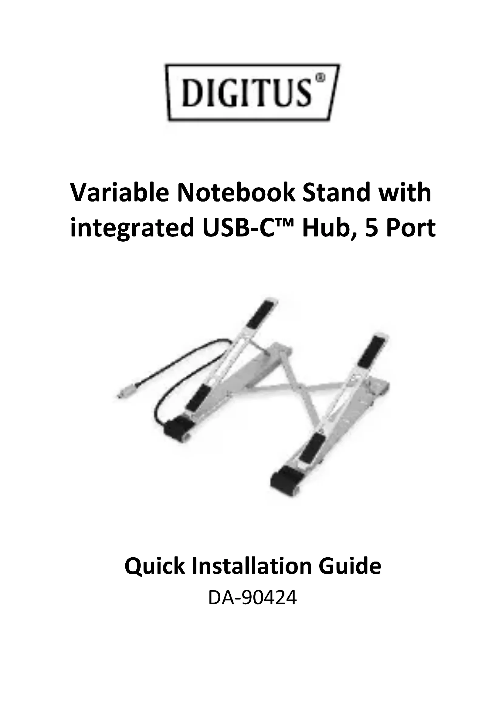 Quick Installation Guide DA-904242 Introduction The adjustable notebook stand from DIGITUS® combines ergonomic design and connectivity in one convenient unit. You can easily adjust the angle of inclination to your height in 5 levels. Your notebook can be connected via the USB- C™ port, allowing you to access all USB interfaces of the hub. 4 fully-functional USB A ports (USB 3.2 Gen1) and a USB- C™ power with Power Delivery are available. An optional USB-C™ power adapter, for example, delivers up to 100 W of charging power (Power Delivery) for a connected notebook and the USB-A ports (85 W / 15 W). Use the advantages of ergonomic design and connectivity in a single unit with the DIGITUS® notebook stand with integrated USB hub.3 Features