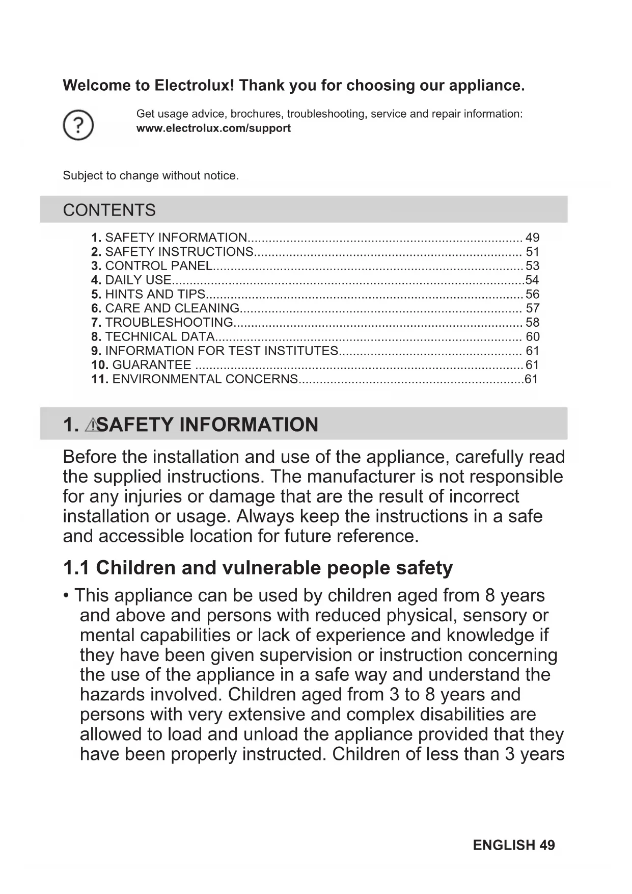 - This appliance can be used by children aged from 8 years and above and persons with reduced physical, sensory or mental capabilities or lack of experience and knowledge if they have been given supervision or instruction concerning the use of the appliance in a safe way and understand the hazards involved. Children aged from 3 to 8 years and persons with very extensive and complex disabilities are allowed to load and unload the appliance provided that they have been properly instructed. Children of less than 3 years ENGLISH 49of age should be kept away from the appliance unless continuously supervised.