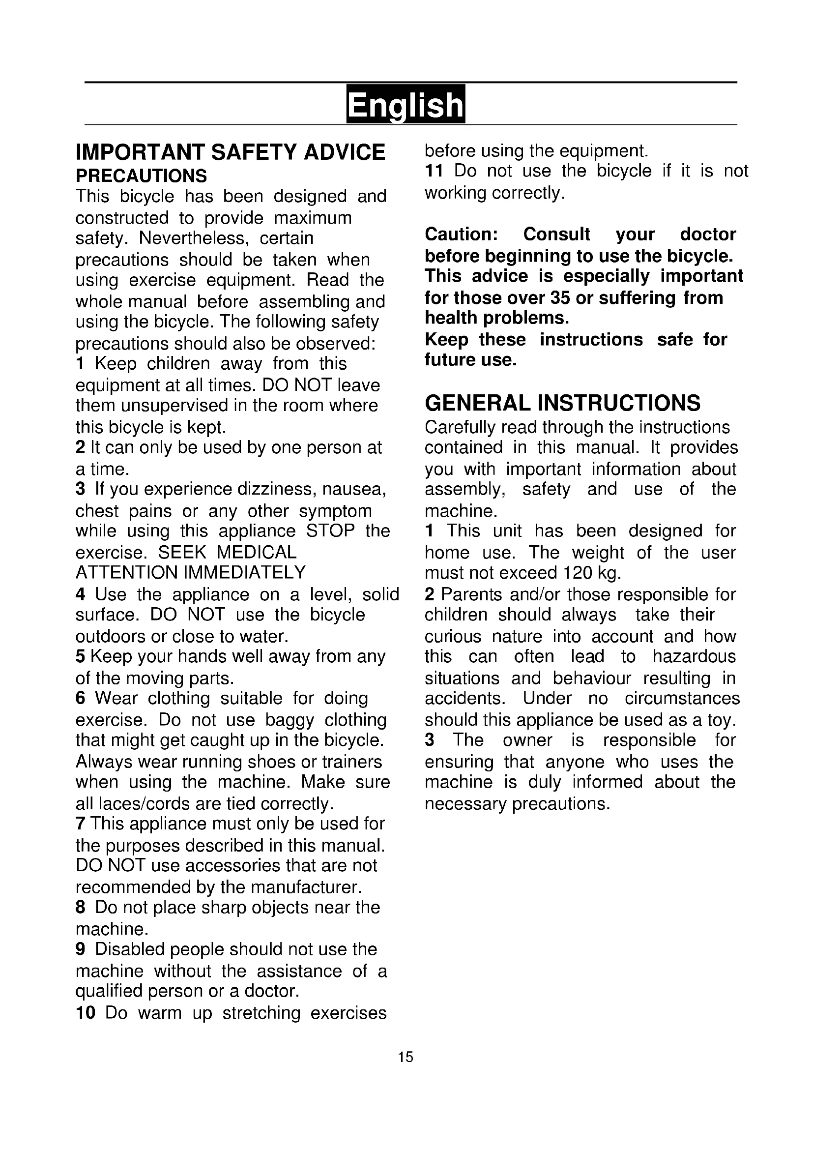 PRECAUTIONS This bicycle has been designed and constructed to provide maximum safety. Nevertheless, certain precautions should be taken when using exercise equipment. Read the whole manual before assembling and using the bicycle. The following safety precautions should also be observed: 1 Keep children away from this equipment at all times. DO NOT leave them unsupervised in the room where this bicycle is kept. 2 It can only be used by one person at a time. 3 If you experience dizziness, nausea, chest pains or any other symptom while using this appliance STOP the exercise. SEEK MEDICAL ATTENTION IMMEDIATELY 4 Use the appliance on a level, solid surface. DO NOT use the bicycle outdoors or close to water. 5 Keep your hands well away from any of the moving parts. 6 Wear clothing suitable for doing exercise. Do not use baggy clothing that might get caught up in the bicycle. Always wear running shoes or trainers when using the machine. Make sure all laces/cords are tied correctly. 7 This appliance must only be used for the purposes described in this manual. DO NOT use accessories that are not recommended by the manufacturer. 8 Do not place sharp objects near the machine. 9 Disabled people should not use the machine without the assistance of a qualified person or a doctor. 10 Do warm up stretching exercises before using the equipment. 11 Do not use the bicycle if it is not working correctly. Caution: Consult your doctor before beginning to use the bicycle. This advice is especially important for those over 35 or suffering from health problems. Keep these instructions safe for future use. GENERAL INSTRUCTIONS Carefully read through the instructions contained in this manual. It provides you with important information about assembly, safety and use of the machine. 1 This unit has been designed for home use. The weight of the user must not exceed 120 kg. 2 Parents and/or those responsible for children should always take their curious nature into account and how this can often lead to hazardous situations and behaviour resulting in accidents. Under no circumstances should this appliance be used as a toy. 3 The owner is responsible for ensuring that anyone who uses the machine is duly informed about the necessary precautions.16