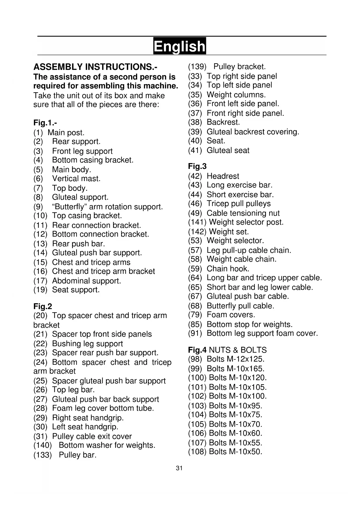 English ASSEMBLY INSTRUCTIONS.- The assistance of a second person is required for assembling this machine. Take the unit out of its box and make sure that all of the pieces are there: Fig.1.- (1) Main post. (2) Rear support. (3) Front leg support (4) Bottom casing bracket. (5) Main body. (6) Vertical mast. (7) Top body. (8) Gluteal support. (9) “Butterfly” arm rotation support. (10) Top casing bracket. (11) Rear connection bracket. (12) Bottom connection bracket. (13) Rear push bar. (14) Gluteal push bar support. (15) Chest and tricep arms (16) Chest and tricep arm bracket (17) Abdominal support. (19) Seat support. Fig.2 (20) Top spacer chest and tricep arm bracket (21) Spacer top front side panels (22) Bushing leg support (23) Spacer rear push bar support. (24) Bottom spacer chest and tricep arm bracket (25) Spacer gluteal push bar support (26) Top leg bar. (27) Gluteal push bar back support (28) Foam leg cover bottom tube. (29) Right seat handgrip. (30) Left seat handgrip. (31) Pulley cable exit cover (140) Bottom washer for weights. (133) Pulley bar. (139) Pulley bracket. (33) Top right side panel (34) Top left side panel (35) Weight columns. (36) Front left side panel. (37) Front right side panel. (38) Backrest. (39) Gluteal backrest covering. (40) Seat. (41) Gluteal seat Fig.3 (42) Headrest (43) Long exercise bar. (44) Short exercise bar. (46) Tricep pull pulleys (49) Cable tensioning nut (141) Weight selector post. (142) Weight set. (53) Weight selector. (57) Leg pull-up cable chain. (58) Weight cable chain. (59) Chain hook. (64) Long bar and tricep upper cable. (65) Short bar and leg lower cable. (67) Gluteal push bar cable. (68) Butterfly pull cable. (79) Foam covers. (85) Bottom stop for weights. (91) Bottom leg support foam cover. Fig.4 NUTS & BOLTS (98) Bolts M-12x125. (99) Bolts M-10x165. (100) Bolts M-10x120. (101) Bolts M-10x105. (102) Bolts M-10x100. (103) Bolts M-10x95. (104) Bolts M-10x75. (105) Bolts M-10x70. (106) Bolts M-10x60. (107) Bolts M-10x55. (108) Bolts M-10x50.32