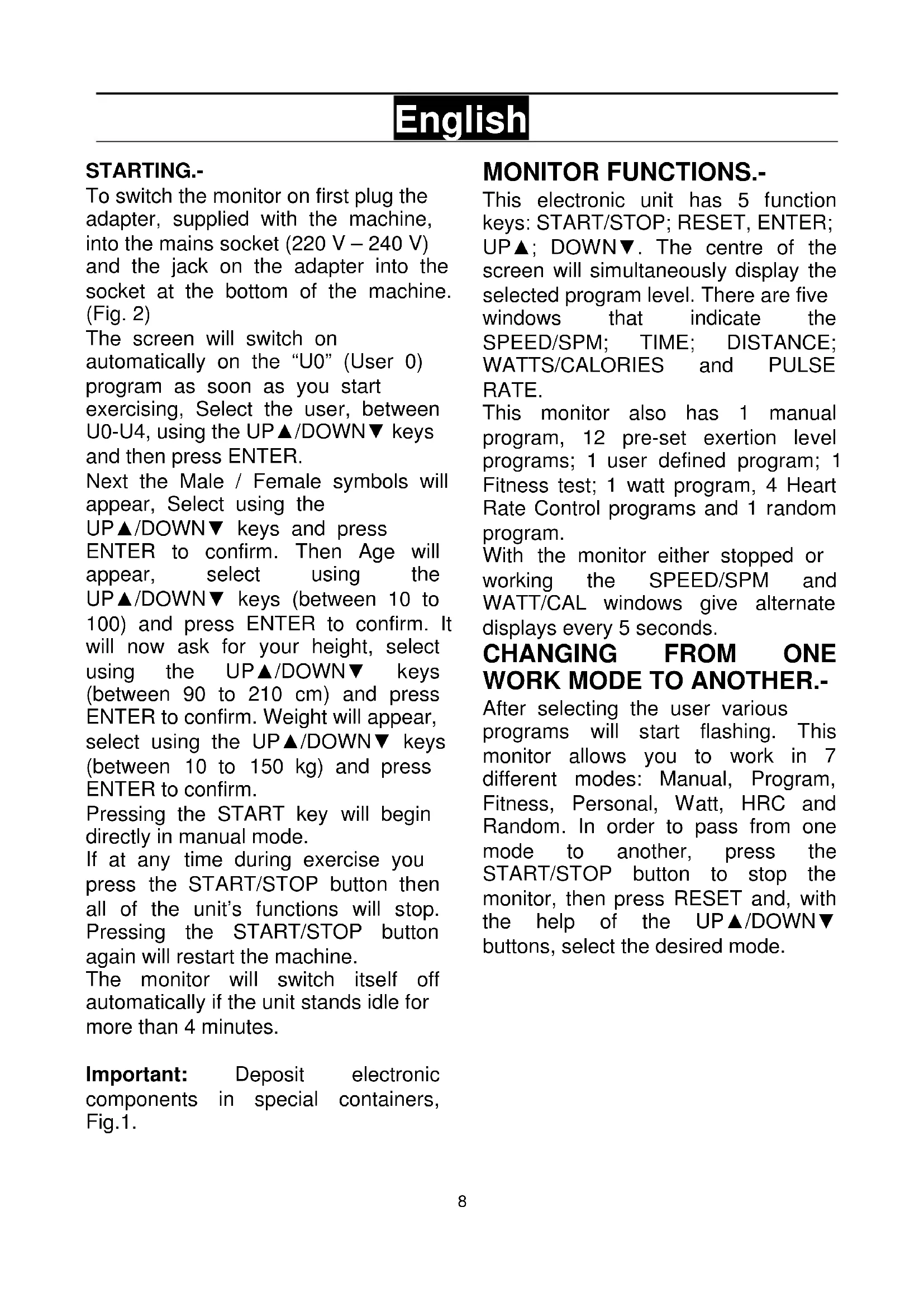 will now ask for your height, select using the UP▲/DOWN▼ keys (between 90 to 210 cm) and press ENTER to confirm. Weight will appear, select using the UP▲/DOWN▼ keys (between 10 to 150 kg) and press ENTER to confirm. Pressing the START key will begin directly in manual mode. If at any time during exercise you press the START/STOP button then all of the unit’s functions will stop. Pressing the START/STOP button again will restart the machine. The monitor will switch itself off automatically if the unit stands idle for more than 4 minutes. Important: Deposit electronic components in special containers, Fig.1.