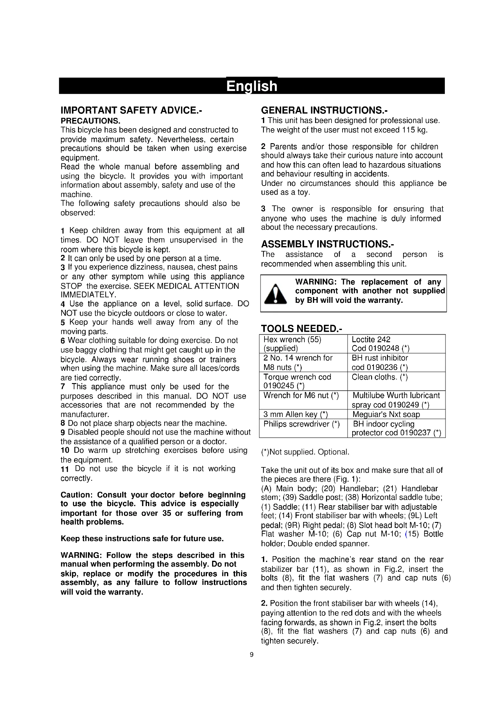 TOOLS NEEDED.- Hex wrench (55) (supplied) Loctite 242 Cod 0190248 (*) 2 No. 14 wrench for M8 nuts (*) BH rust inhibitor cod 0190236 (*) Torque wrench cod 0190245 (*) Clean cloths. (*) Wrench for M6 nut (*) Multilube Wurth lubricant spray cod 0190249 (*) 3 mm Allen key (*) Meguiar's Nxt soap Philips screwdriver (*) BH indoor cycling protector cod 0190237 (*) (*)Not supplied. Optional. Take the unit out of its box and make sure that all of the pieces are there (Fig. 1): (A) Main body; (20) Handlebar; (21) Handlebar stem; (39) Saddle post; (38) Horizontal saddle tube; (1) Saddle; (11) Rear stabiliser bar with adjustable feet; (14) Front stabiliser bar with wheels; (9L) Left pedal; (9R) Right pedal; (8) Slot head bolt M-10; (7) Flat washer M-10; (6) Cap nut M-10; (15) Bottle holder; Double ended spanner.