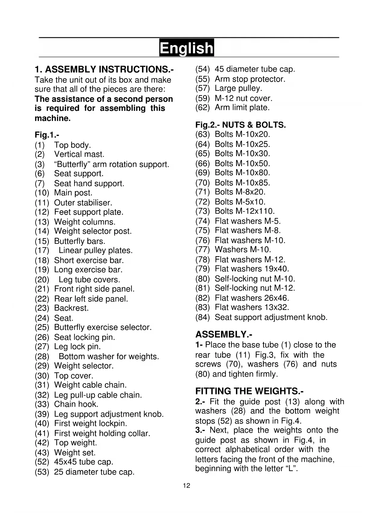 Take the unit out of its box and make sure that all of the pieces are there: The assistance of a second person is required for assembling this machine. Fig.1.- (1) Top body. (2) Vertical mast. (3) “Butterfly” arm rotation support. (6) Seat support. (7) Seat hand support. (10) Main post. (11) Outer stabiliser. (12) Feet support plate. (13) Weight columns. (14) Weight selector post. (15) Butterfly bars. (17) Linear pulley plates. (18) Short exercise bar. (19) Long exercise bar. (20) Leg tube covers. (21) Front right side panel. (22) Rear left side panel. (23) Backrest. (24) Seat. (25) Butterfly exercise selector. (26) Seat locking pin. (27) Leg lock pin. (28) Bottom washer for weights. (29) Weight selector. (30) Top cover. (31) Weight cable chain. (32) Leg pull-up cable chain. (33) Chain hook. (39) Leg support adjustment knob. (40) First weight lockpin. (41) First weight holding collar. (42) Top weight. (43) Weight set. (52) 45x45 tube cap. (53) 25 diameter tube cap. (54) 45 diameter tube cap. (55) Arm stop protector. (57) Large pulley. (59) M-12 nut cover. (62) Arm limit plate. Fig.2.- NUTS & BOLTS. (63) Bolts M-10x20. (64) Bolts M-10x25. (65) Bolts M-10x30. (66) Bolts M-10x50. (69) Bolts M-10x80. (70) Bolts M-10x85. (71) Bolts M-8x20. (72) Bolts M-5x10. (73) Bolts M-12x110. (74) Flat washers M-5. (75) Flat washers M-8. (76) Flat washers M-10. (77) Washers M-10. (78) Flat washers M-12. (79) Flat washers 19x40. (80) Self-locking nut M-10. (81) Self-locking nut M-12. (82) Flat washers 26x46. (83) Flat washers 13x32. (84) Seat support adjustment knob. ASSEMBLY.-