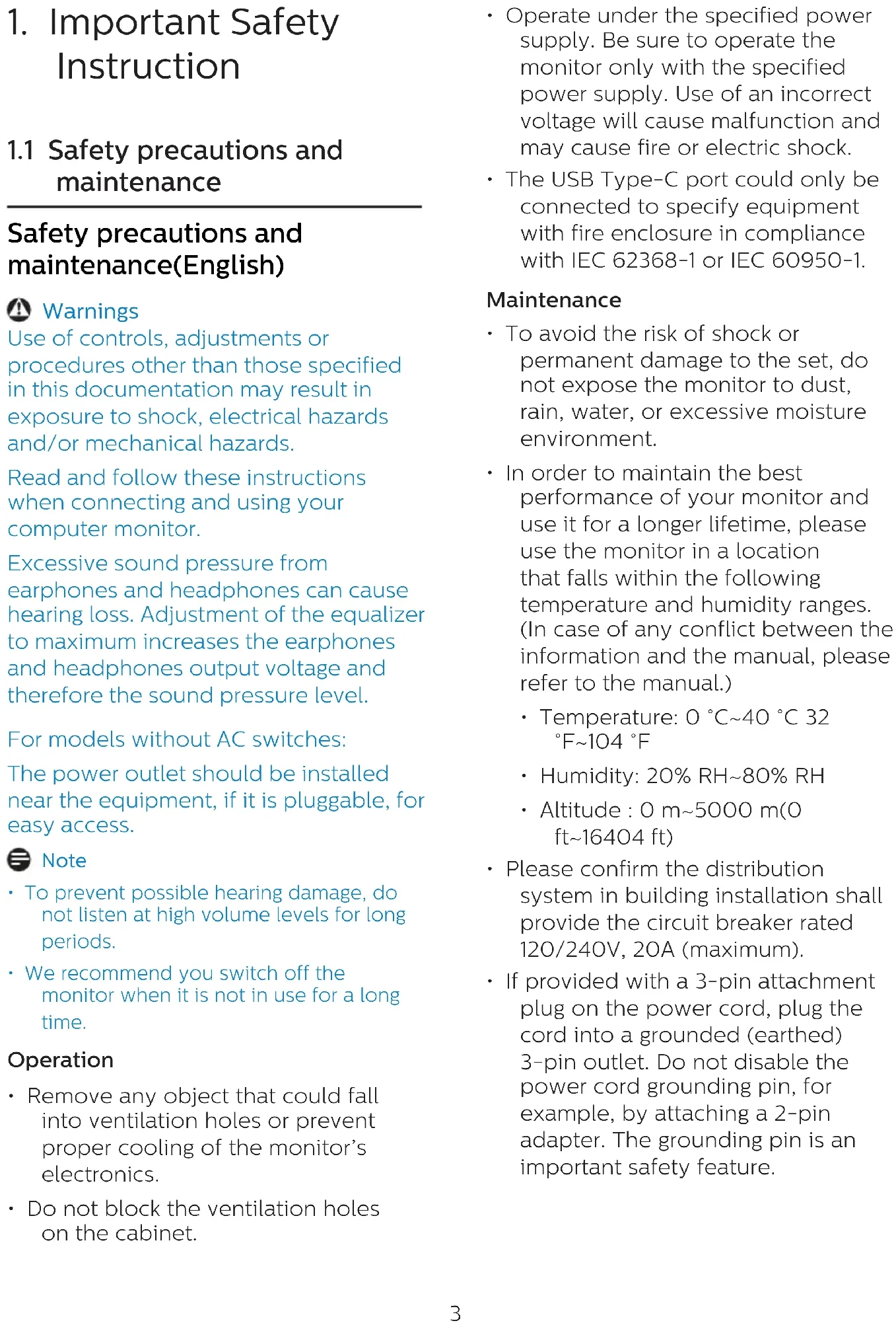 maintenance Safety precautions and maintenance(English) Warnings Use of controls, adjustments or procedures other than those specified in this documentation may result in exposure to shock, electrical hazards and/or mechanical hazards. Read and follow these instructions when connecting and using your computer monitor. Excessive sound pressure from earphones and headphones can cause hearing loss. Adjustment of the equalizer to maximum increases the earphones and headphones output voltage and therefore the sound pressure level. For models without AC switches: The power outlet should be installed near the equipment, if it is pluggable, for easy access. Note