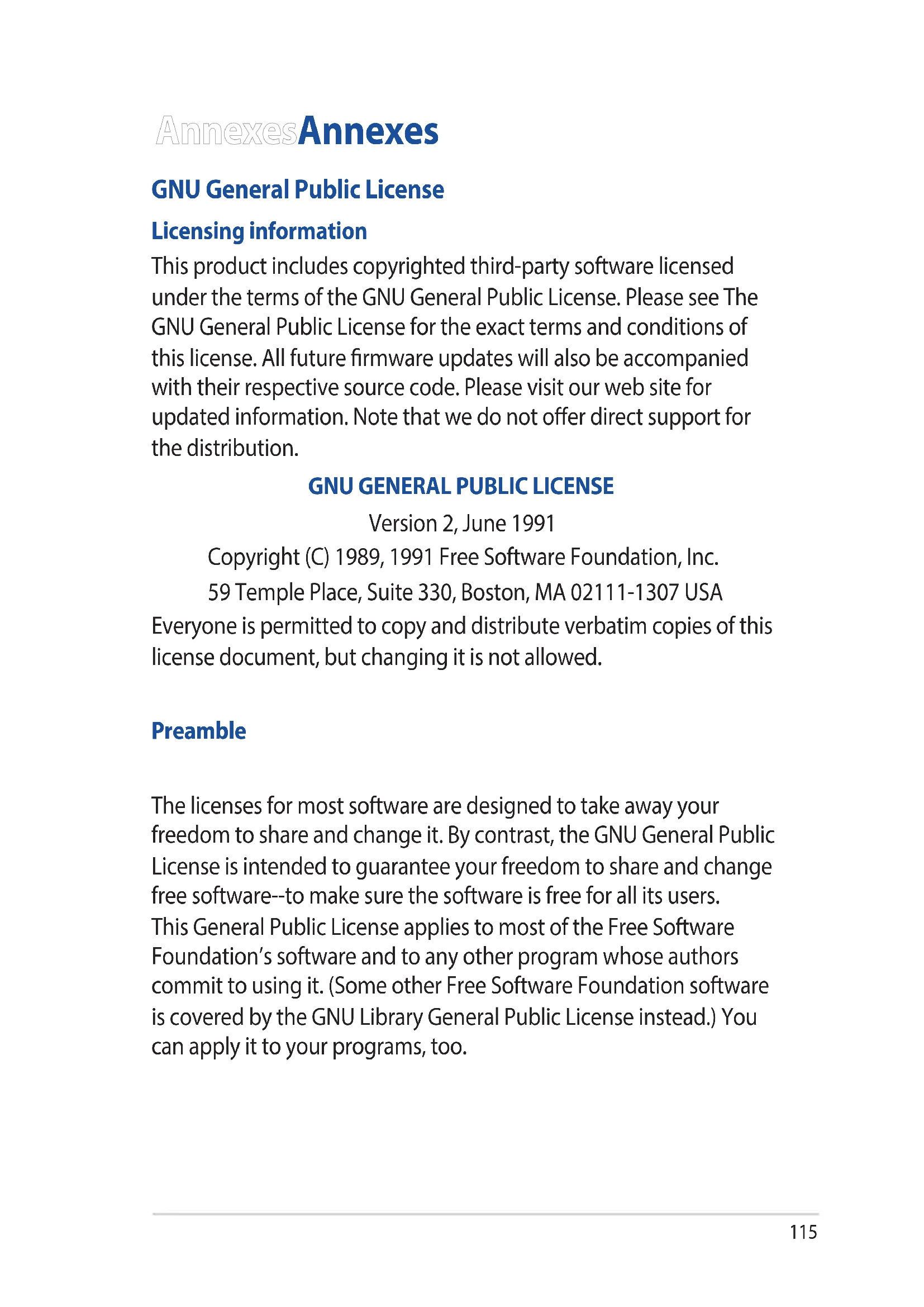 Version 2, June 1991 Copyright (C) 1989, 1991 Free Software Foundation, Inc. 59 Temple Place, Suite 330, Boston, MA 02111-1307 USA Everyone is permitted to copy and distribute verbatim copies of this license document, but changing it is not allowed. Preamble The licenses for most software are designed to take away your freedom to share and change it. By contrast, the GNU General Public License is intended to guarantee your freedom to share and change free software--to make sure the software is free for all its users. This General Public License applies to most of the Free Software Foundation’s software and to any other program whose authors commit to using it. (Some other Free Software Foundation software is covered by the GNU Library General Public License instead.) You can apply it to your programs, too.116 When we speak of free software, we are referring to freedom, not price. Our General Public Licenses are designed to make sure that you have the freedom to distribute copies of free software (and charge for this service if you wish), that you receive source code or can get it if you want it, that you can change the software or use pieces of it in new free programs; and that you know you can do these things. To protect your rights, we need to make restrictions that forbid anyone to deny you these rights or to ask you to surrender the rights. These restrictions translate to certain responsibilities for you if you distribute copies of the software, or if you modify it. For example, if you distribute copies of such a program, whether gratis or for a fee, you must give the recipients all the rights that you have. You must make sure that they, too, receive or can get the source code. And you must show them these terms so they know their rights. We protect your rights with two steps: (1) copyright the software, and (2) oer you this license which gives you legal permission to copy, distribute and/or modify the software. Also, for each author’s protection and ours, we want to make certain that everyone understands that there is no warranty for this free software. If the software is modied by someone else and passed on, we want its recipients to know that what they have is not the original, so that any problems introduced by others will not reect on the original authors’ reputations.117 Finally, any free program is threatened constantly by software patents. We wish to avoid the danger that redistributors of a free program will individually obtain patent licenses, in eect making the program proprietary. To prevent this, we have made it clear that any patent must be licensed for everyone’s free use or not licensed at all. The precise terms and conditions for copying, distribution and modication follow. Terms & conditions for copying, distribution, & modication