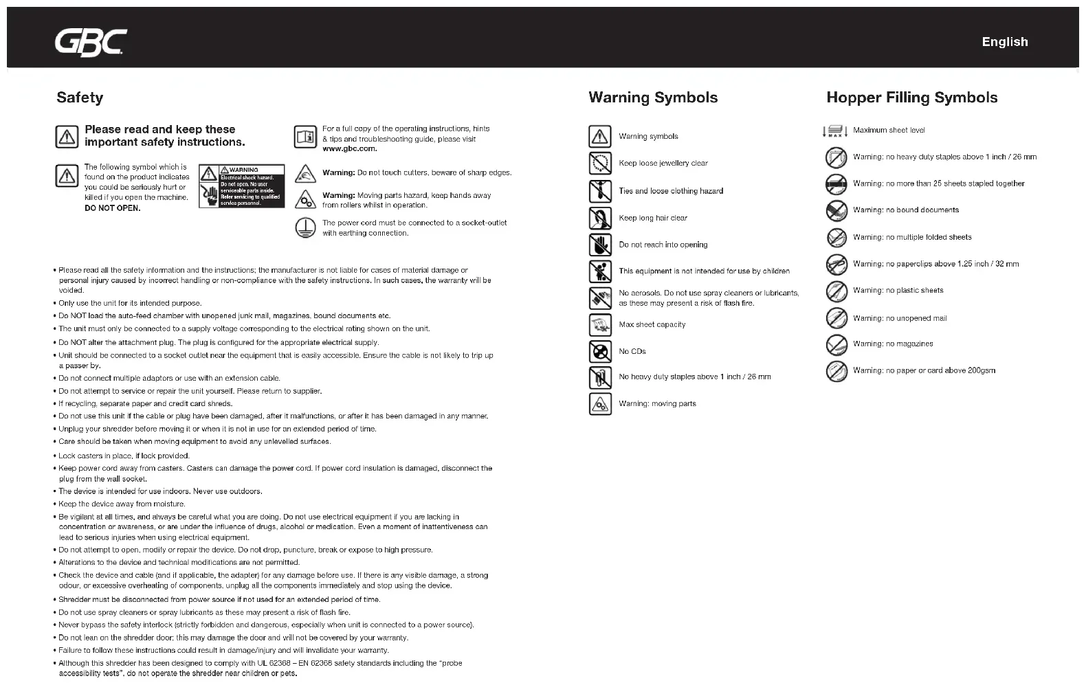 SHREDDERS Sheet Capacity Bin Size Manual Feed Gallons / Liters 6 5.3 / 20 8 9 / 34 6 9 / 34 8 11.6 / 44 6 11.6 / 44 10 15.9 / 60 8 15.9 / 60 10 15.9 / 60 8 15.9 / 60 15 29 / 110 10 29 / 110 20 37 / 140 15 37 / 140 English Operation Power On Manual Shredding Auto Shredding Remove Jam Credit Card Shredding 4 5English Safety Please read and keep these For a full copy of the operating instructions, hints & tips and troubleshooting guide, please visit important safety instructions. www.gbc.com. The following symbol which is WARNING Electrical shock hazard. Do not open. No user serviceable parts inside. Refer servicing to qualified service personnel.