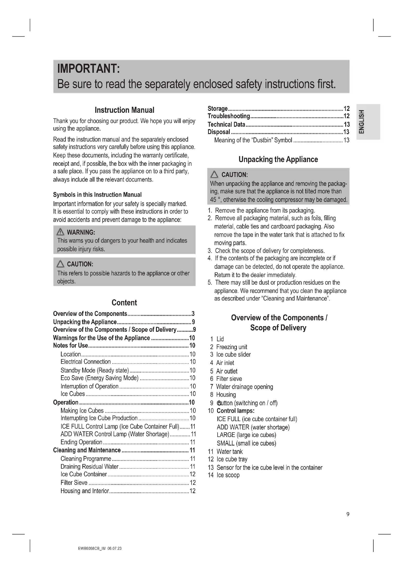 appliance. We recommend that you clean the appliance as described under “Cleaning and Maintenance”. Overview of the Components / Scope of Delivery 1 Lid 2 Freezing unit 3 Ice cube slider 4 Air inlet 5 Air outlet 6 Filter sieve 7 Water drainage opening 8 Housing 9 button (switching on / off) 10 Control lamps: ICE FULL (ice cube container full) ADD WATER (water shortage) LARGE (large ice cubes) SMALL (small ice cubes) 11 Water tank 12 Ice cube tray 13 Sensor for the ice cube level in the container 14 Ice scoopEWB6068CB_IM 06.07.23