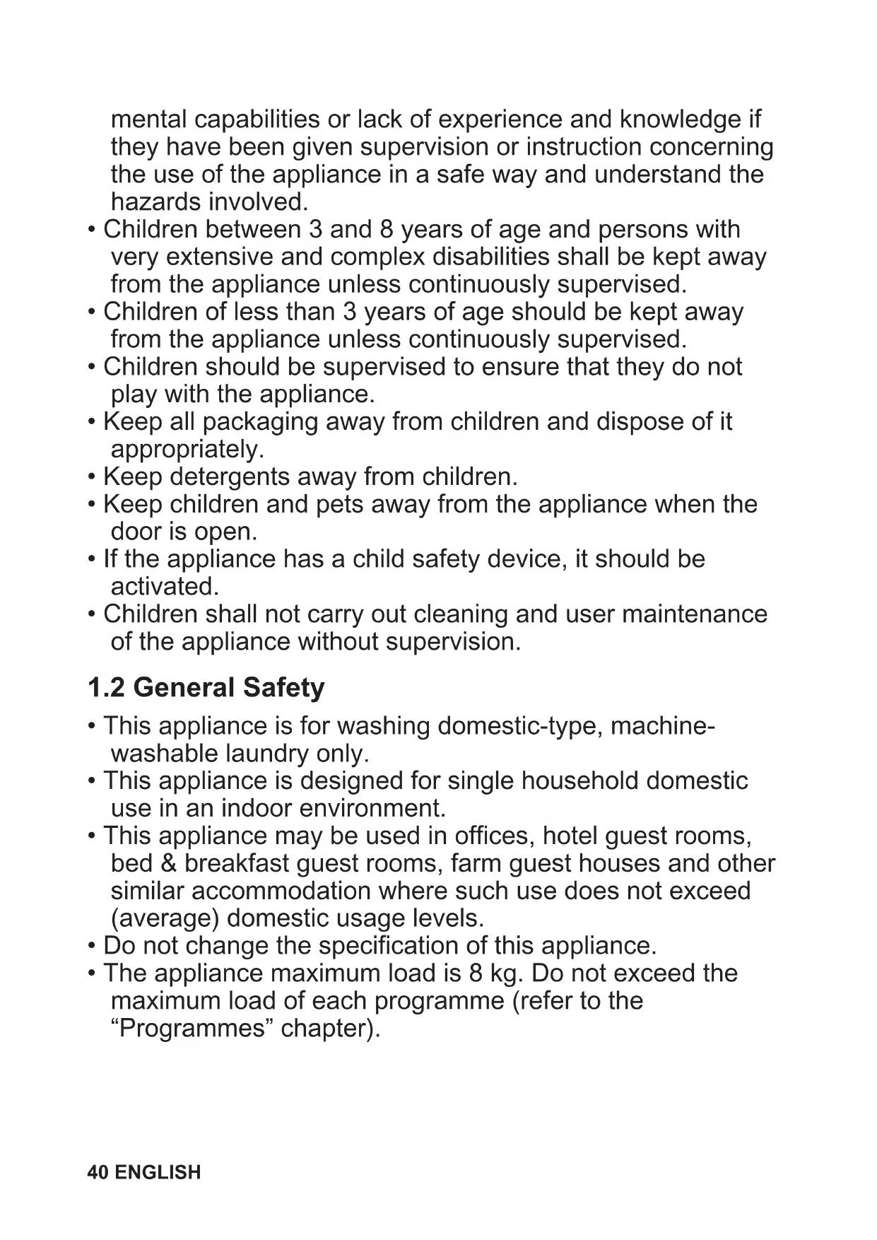 - The appliance maximum load is 8 kg. Do not exceed the maximum load of each programme (refer to the “Programmes” chapter). 40 ENGLISH• The operating water pressure at the water entry point from the outlet connection must be between 0.5 bar (0.05 MPa) and 10 bar (1.0 MPa).