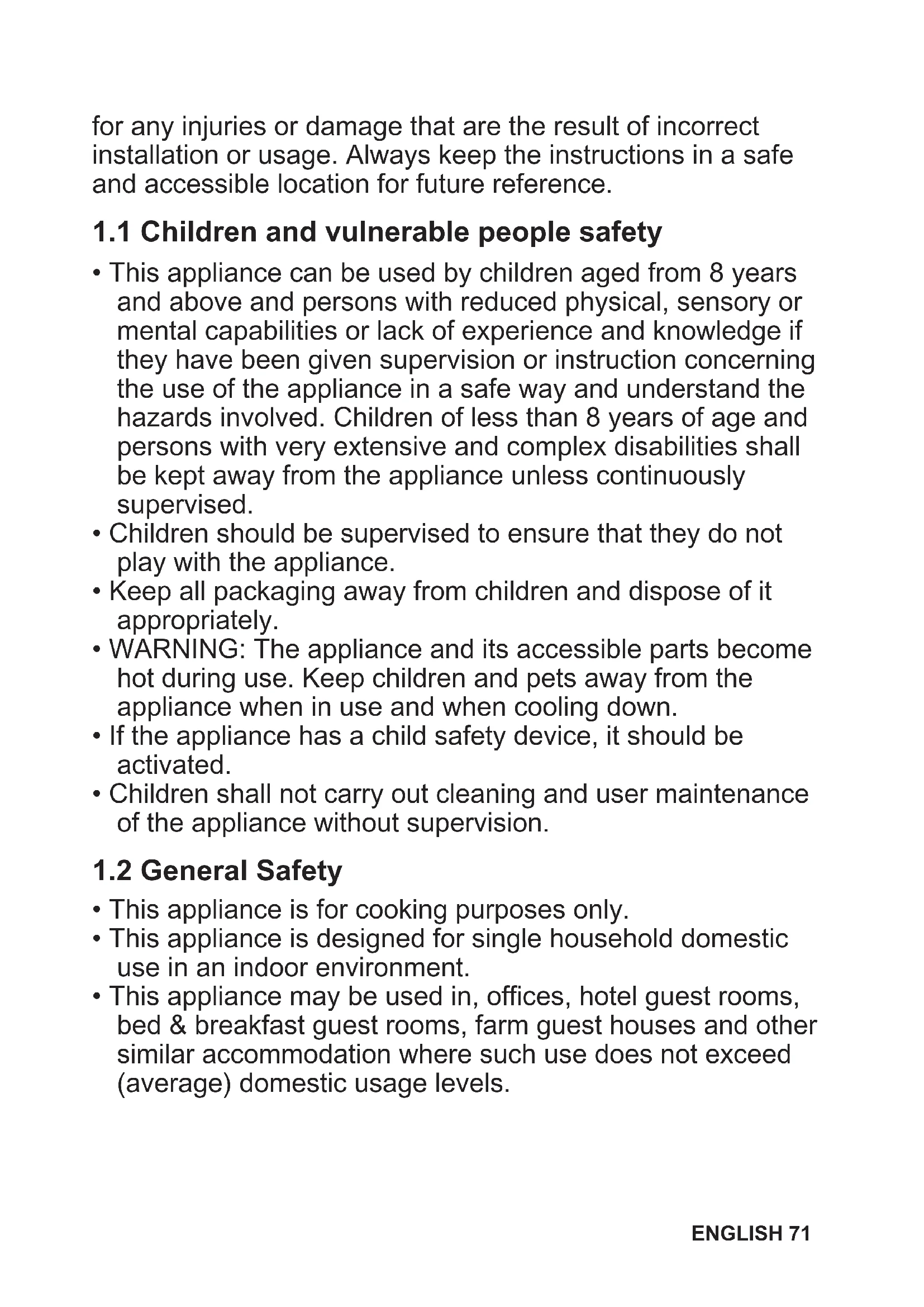 Before the installation and use of the appliance, carefully read the supplied instructions. The manufacturer is not responsible 70 ENGLISHfor any injuries or damage that are the result of incorrect installation or usage. Always keep the instructions in a safe and accessible location for future reference.
