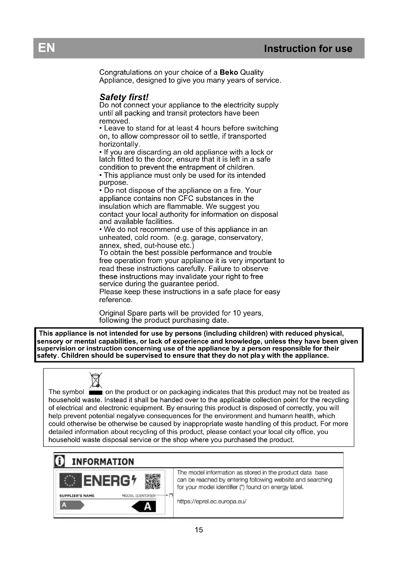The symbol on the product or on packaging indicates that this product may not be treated as household waste. Instead it shall be handed over to the applicable collection point for the recycling of electrical and electronic equipment. By ensuring this product is disposed of correctly, you will help prevent potential negatyve consequences for the environment and humann health, which could otherwise be otherwise be caused by inappropriate waste handling of this product. For more detailed information about recycling of this product, please contact your local city office, you household waste disposal service or the shop where you purchased the product.EN Instruction for use Electrical requirements Before inserting the plug into the wall socket make sure that the voltage and the frequency shown in the rating plate inside the appliance corresponds to your electricity supply. We recommend that this appliance is connected to the mains supply via a suitably switched and fused socket in a readily accessible position. Warning! This appliance must be earthed. Repairs to electrical equipment should only be performed by a qualified technician. Incorrect repairs carried out by an unqualified person are carry risks that may have critical consequences for the user of the appliance. ATTENTION! This appliance operates with R600a which is an environmental friendly but flammable gas. During the transportation and fixing of the product, care must be taken not to damage the cooling system. If the cooling system is damaged and there is a gas leakage from the system, keep the product away from open flame sources and ventilate the room for a while. WARNING - Do not use mechanical devices or other means to accelerate the defrosting process, others than those recommended by the manufacturer. WARNING - Do not damage the refrigerant circuit. WARNING - Do not use electrical appliances inside the food storage compartments of the appliance, unless they are of the type recommended by the manufacturer. WARNING - If the supply cord is damaged, it must be replaced by the manufacturer, its service agent or similarly qualified persons in order to avoid a hazard. Transportation instructions