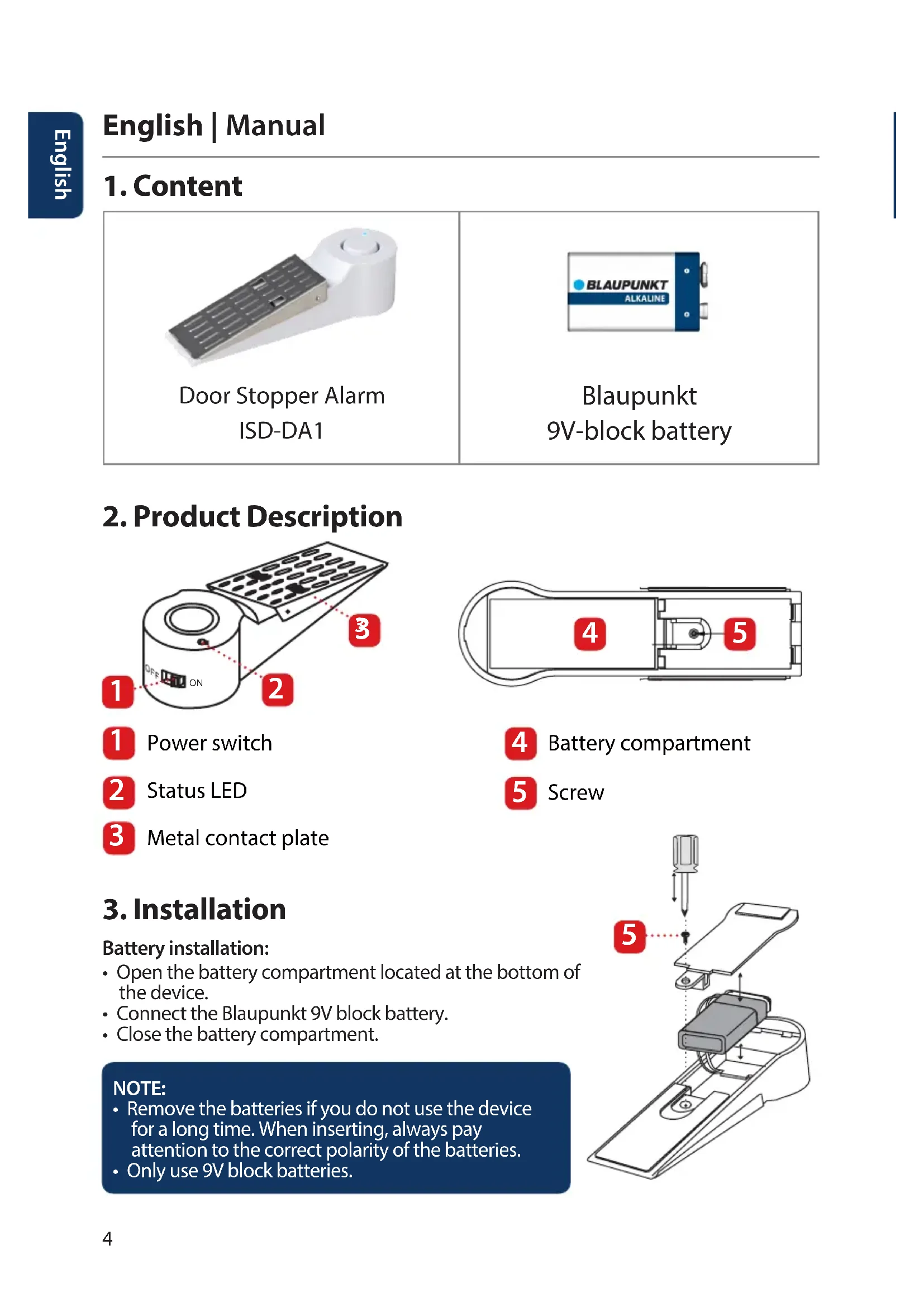 - Please visit our website or contact your local service engineer for more information at: http://security.blaupunkt-service.com Door stopper alarm Model: ISD-DA1 Voltage supply 9 V block battery Siren volume 100dB @ 1 meter Minimum door gap height 6 mm Maximum door gap height 30 mm Material housing ABS Weight 152g(battery included) Operating conditions -20°C to +40°C Dimensions (W x H ) 175*50*42mm