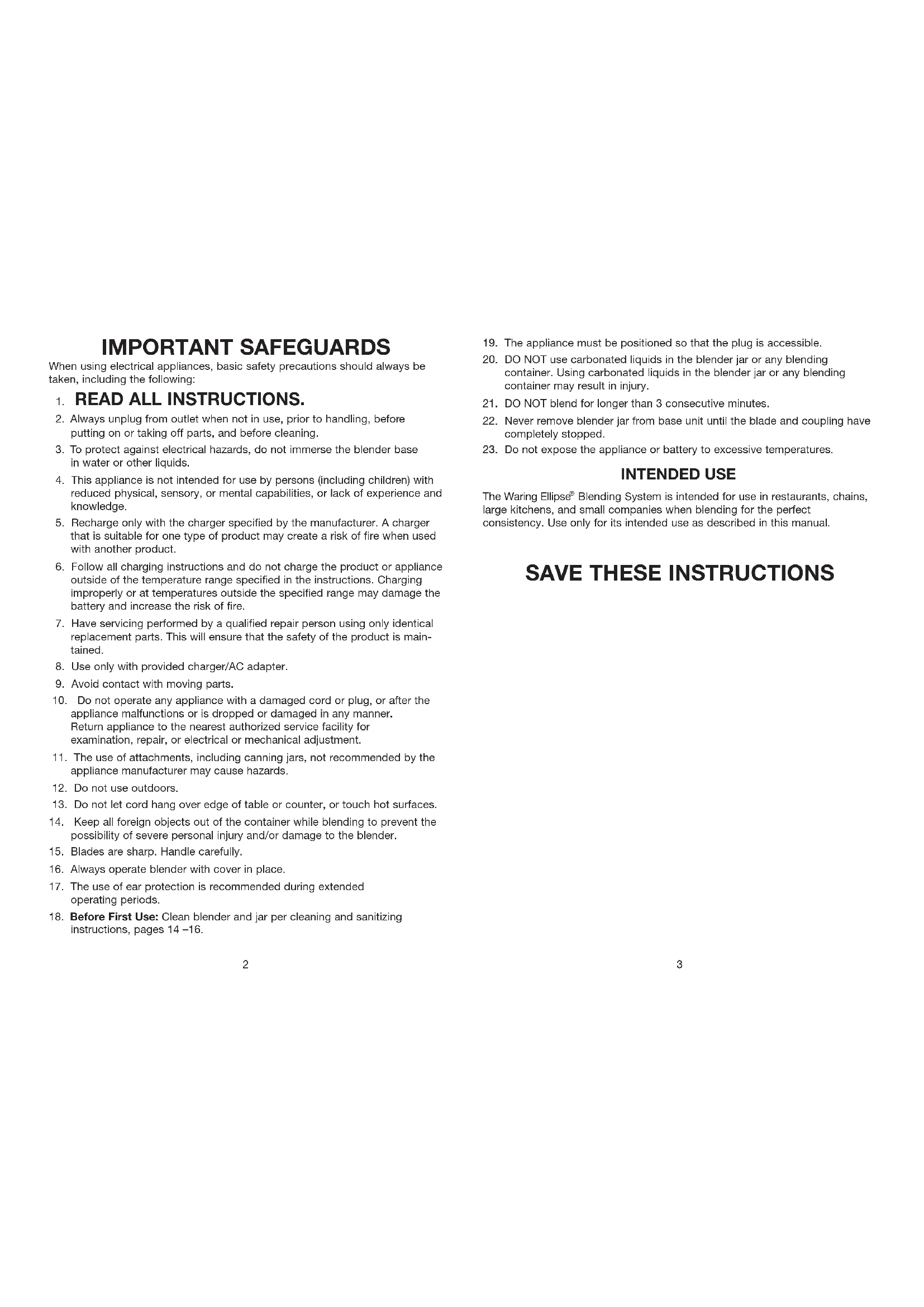 20. DO NOT use carbonated liquids in the blender jar or any blending