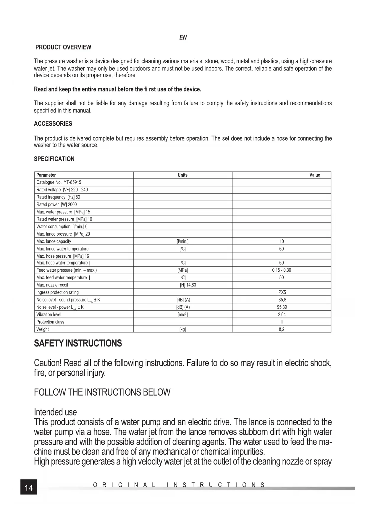 ORIGINAL INSTRUCTIONS PRODUCT OVERVIEW The pressure washer is a device designed for cleaning various materials: stone, wood, metal and plastics, using a high-pressure water jet. The washer may only be used outdoors and must not be used indoors. The correct, reliable and safe operation of the device depends on its proper use, therefore: Read and keep the entire manual before the fi rst use of the device. The supplier shall not be liable for any damage resulting from failure to comply the safety instructions and recommendations specifi ed in this manual. ACCESSORIES The product is delivered complete but requires assembly before operation. The set does not include a hose for connecting the washer to the water source. SPECIFICATION Parameter Units Value Catalogue No. YT-85915 Rated voltage [V~] 220 - 240 Rated frequency [Hz] 50 Rated power [W] 2000 Max. water pressure [MPa] 15 Rated water pressure [MPa] 10 Water consumption [l/min.] 6 Max. lance pressure [MPa] 20 Max. lance capacity [l/min.] 10 Max. lance water temperature [