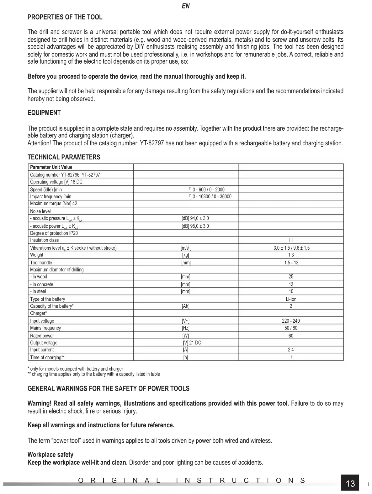 The drill and screwer is a universal portable tool which does not require external power supply for do-it-yourself enthusiasts designed to drill holes in distinct materials (e.g. wood and wood-derived materials, metals) and to screw and unscrew bolts. Its special advantages will be appreciated by DIY enthusiasts realising assembly and fi nishing jobs. The tool has been designed solely for domestic work and must not be used professionally, i.e. in workshops and for remunerable jobs. A correct, reliable and safe functioning of the electric tool depends on its proper use, so: Before you proceed to operate the device, read the manual thoroughly and keep it. The supplier will not be held responsible for any damage resulting from the safety regulations and the recommendations indicated hereby not being observed. EQUIPMENT The product is supplied in a complete state and requires no assembly. Together with the product there are provided: the recharge- able battery and charging station (charger). Attention! The product of the catalog number: YT-82797 has not been equipped with a rechargeable battery and charging station. TECHNICAL PARAMETERS Parameter Unit Value Catalog number YT-82796, YT-82797 Operating voltage [V] 18 DC Speed (idle) [min