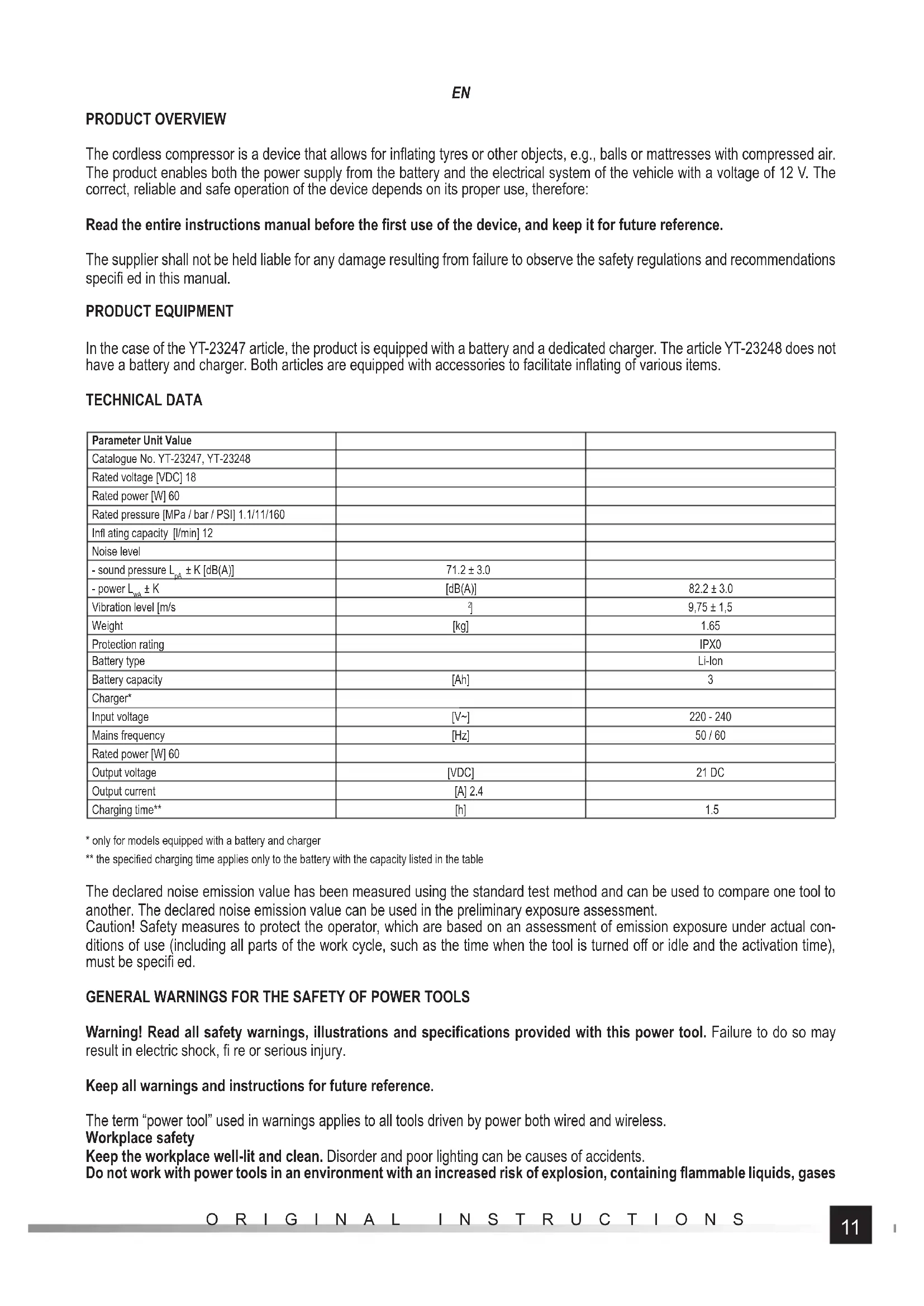 ORIGINAL INSTRUCTIONS PRODUCT OVERVIEW The cordless compressor is a device that allows for infl ating tyres or other objects, e.g., balls or mattresses with compressed air. The product enables both the power supply from the battery and the electrical system of the vehicle with a voltage of 12 V. The correct, reliable and safe operation of the device depends on its proper use, therefore: Read the entire instructions manual before the fi rst use of the device, and keep it for future reference. The supplier shall not be held liable for any damage resulting from failure to observe the safety regulations and recommendations specifi ed in this manual. PRODUCT EQUIPMENT In the case of the YT-23247 article, the product is equipped with a battery and a dedicated charger. The article YT-23248 does not have a battery and charger. Both articles are equipped with accessories to facilitate infl ating of various items. TECHNICAL DATA Parameter Unit Value Catalogue No. YT-23247, YT-23248 Rated voltage [VDC] 18 Rated power [W] 60 Rated pressure [MPa / bar / PSI] 1.1/11/160 Infl ating capacity [l/min] 12 Noise level - sound pressure L