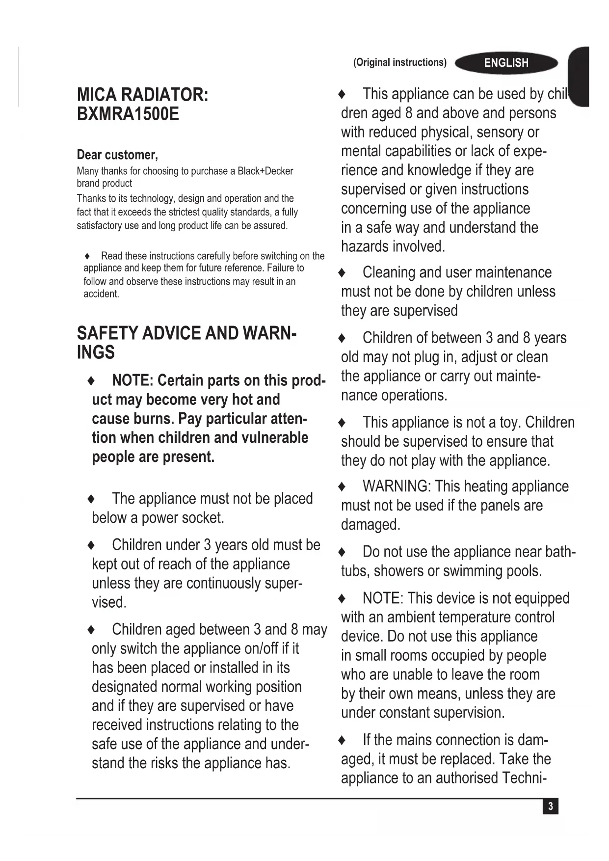 MICA RADIATOR: BXMRA1500E Dear customer, Many thanks for choosing to purchase a Black+Decker brand product Thanks to its technology, design and operation and the fact that it exceeds the strictest quality standards, a fully satisfactory use and long product life can be assured. ♦ Read these instructions carefully before switching on the appliance and keep them for future reference. Failure to follow and observe these instructions may result in an accident.