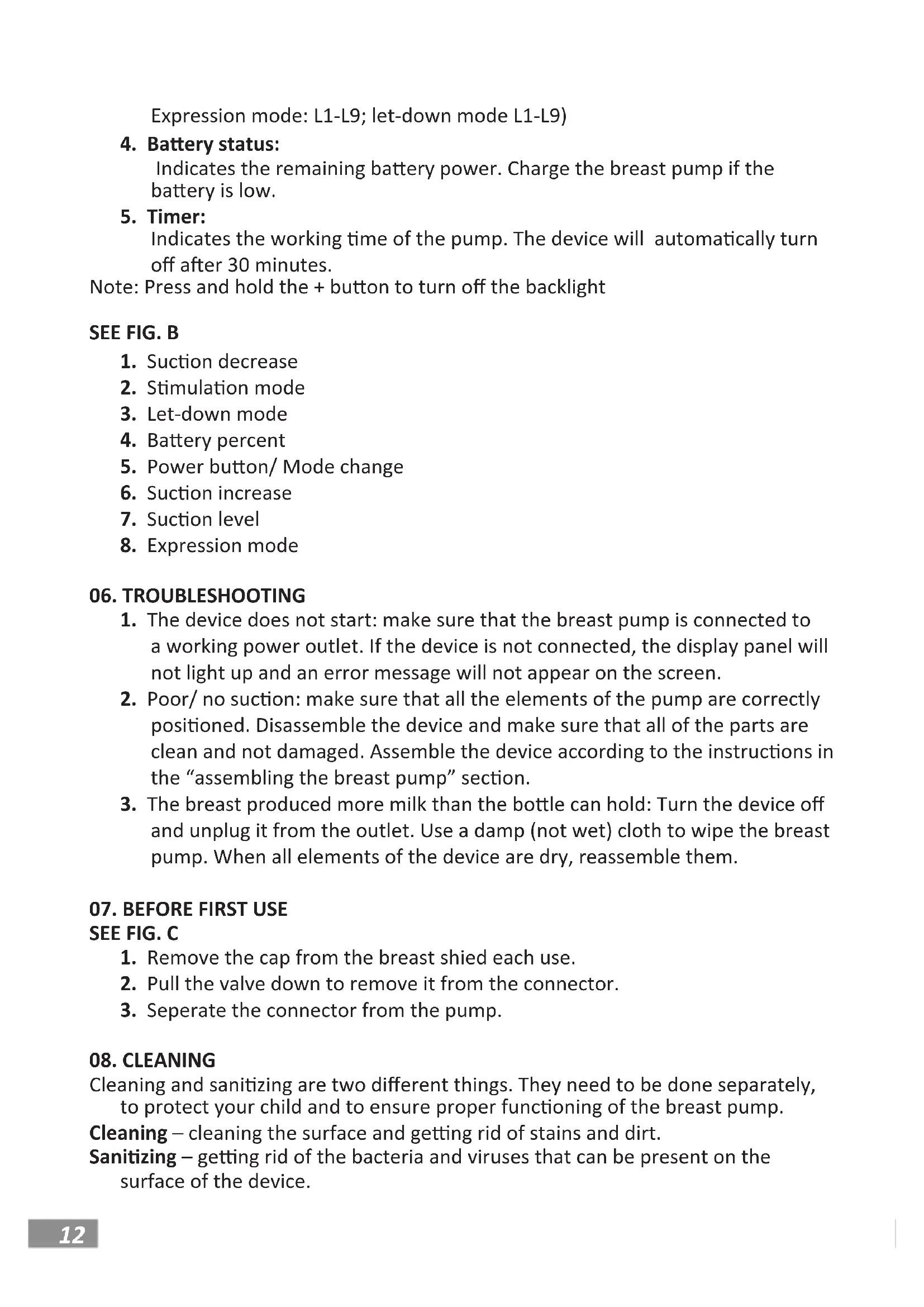 12. If the breast pump causes you pain and discomfort during use, turn it o and