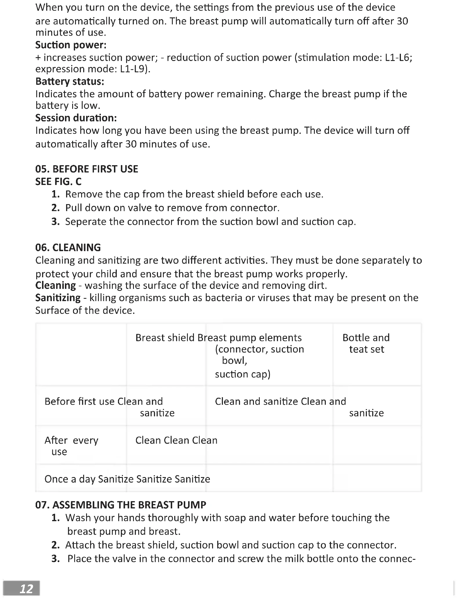 Cleaning and sanizing are two dierent acvies. They must be done separately to protect your child and ensure that the breast pump works properly. Cleaning - washing the surface of the device and removing dirt. Sanizing - killing organisms such as bacteria or viruses that may be present on the Surface of the device. Breast shield Breast pump elements (connector, sucon bowl, sucon cap) Bole and teat set Before rst use Clean and sanize Clean and sanize Clean and sanize Aer every use Clean Clean Clean Once a day Sanize Sanize Sanize