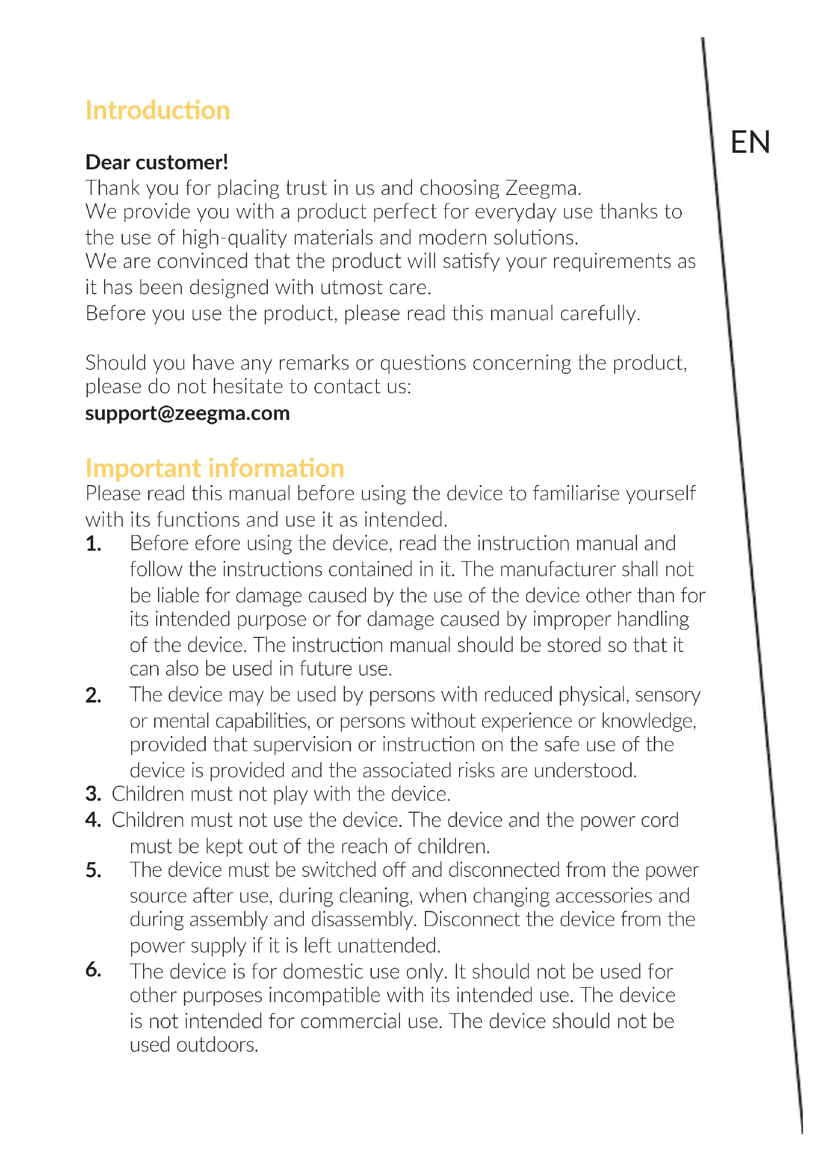 8EN Introducon Dear customer! Thank you for placing trust in us and choosing Zeegma. We provide you with a product perfect for everyday use thanks to the use of high-quality materials and modern soluons. We are convinced that the product will sasfy your requirements as it has been designed with utmost care. Before you use the product, please read this manual carefully. Should you have any remarks or quesons concerning the product, please do not hesitate to contact us: support@zeegma.com Important informaon Please read this manual before using the device to familiarise yourself with its funcons and use it as intended.