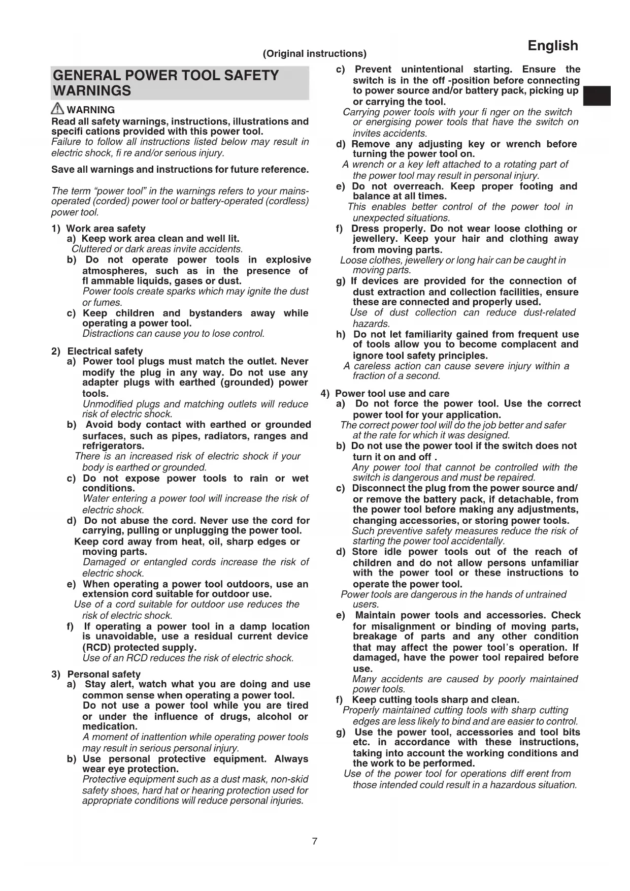 a) Stay alert, watch what you are doing and use common sense when operating a power tool. Do not use a power tool while you are tired or under the infl uence of drugs, alcohol or medication. A moment of inattention while operating power tools may result in serious personal injury. b) Use personal protective equipment. Always wear eye protection. Protective equipment such as a dust mask, non-skid safety shoes, hard hat or hearing protection used for appropriate conditions will reduce personal injuries. (Original instructions) 00BookG1812DEEU.indb700BookG1812DEEU.indb7 2022/11/2814:50:462022/11/2814:50:468 English h) Keep handles and grasping surfaces dry, clean and free from oil and grease. Slippery handles and grasping surfaces do not allow for safe handling and control of the tool in unexpected situations.