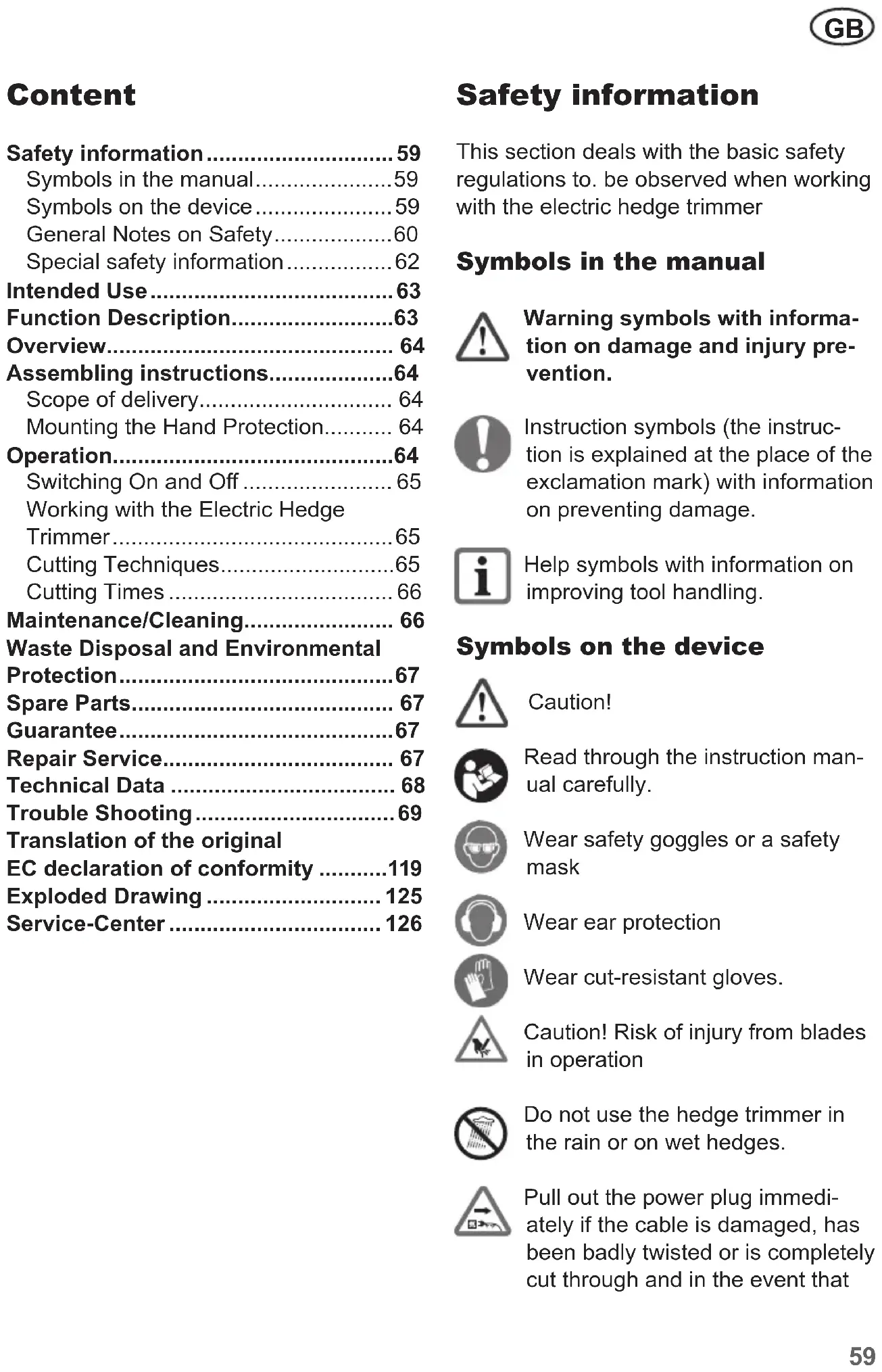 - Safety information This section deals with the basic safety regulations to. be observed when working with the electric hedge trimmer Symbols in the manual Warning symbols with informa- tion on damage and injury pre- vention. Instruction symbols (the instruc- tion is explained at the place of the exclamation mark) with information on preventing damage. Help symbols with information on improving tool handling. Symbols on the device Caution! Read through the instruction man- ual carefully. Wear safety goggles or a safety mask Wear ear protection Wear cut-resistant gloves. Caution! Risk of injury from blades in operation Do not use the hedge trimmer in the rain or on wet hedges. Pull out the power plug immedi- ately if the cable is damaged, has been badly twisted or is completely cut through and in the event that Content Safety information p. 59