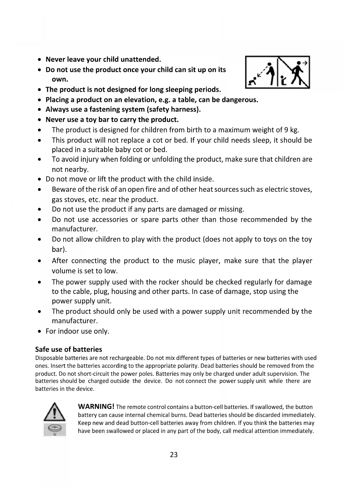 Maintenance and cleaning The seat pad, pillow and the toy bar: Clean with a clean, damp cloth and mild soap. Leave to air-dry. Do not immerse in water. Rocker foot: clean with a soft, clean and dry cloth.26 Storage Keep the product out of the reach of children. Batteries should be removed from the product if it is not used for a long time to avoid corrosion and leakage.