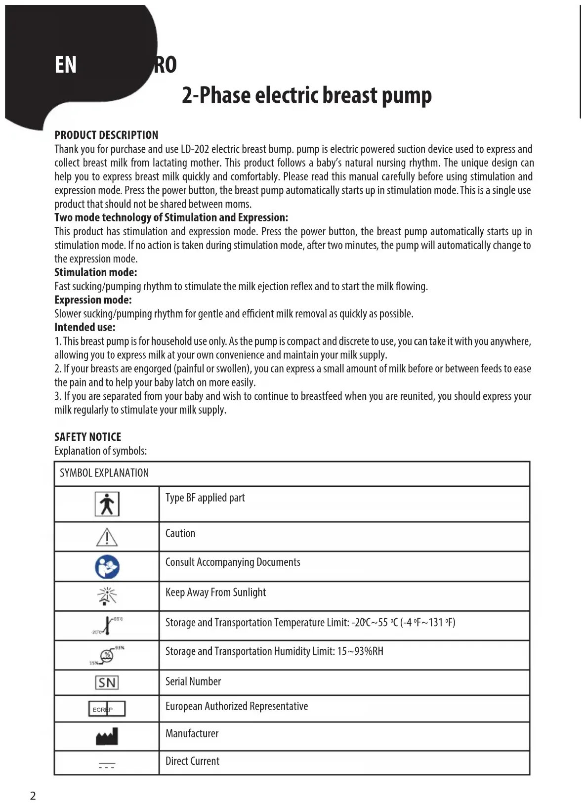 2-Phase electric breast pump SYMBOL EXPLANATION Type BF applied part Caution Consult Accompanying Documents Keep Away From Sunlight Storage and Transportation Temperature Limit: -20
