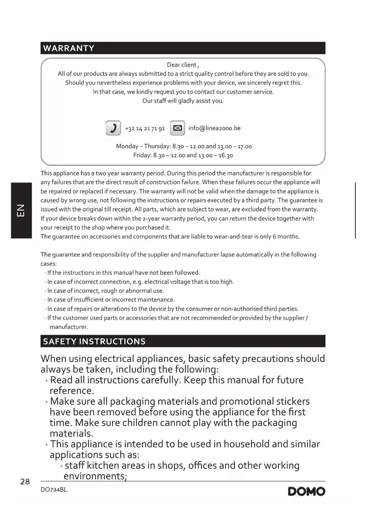 WARRANTY Dear client , All of our products are always submitted to a strict quality control before they are sold to you. Should you nevertheless experience problems with your device, we sincerely regret this. In that case, we kindly request you to contact our customer service. Our sta will gladly assist you. +32 14 21 71 91 info@linea2000.be Monday – Thursday: 8.30 – 12.00 and 13.00 – 17.00 Friday: 8.30 – 12.00 and 13.00 – 16.30 This appliance has a two year warranty period. During this period the manufacturer is responsible for any failures that are the direct result of construction failure. When these failures occur the appliance will be repaired or replaced if necessary. The warranty will not be valid when the damage to the appliance is caused by wrong use, not following the instructions or repairs executed by a third party. The guarantee is issued with the original till receipt. All parts, which are subject to wear, are excluded from the warranty. If your device breaks down within the 2-year warranty period, you can return the device together with your receipt to the shop where you purchased it. The guarantee on accessories and components that are liable to wear-and-tear is only 6 months. The guarantee and responsibility of the supplier and manufacturer lapse automatically in the following cases: