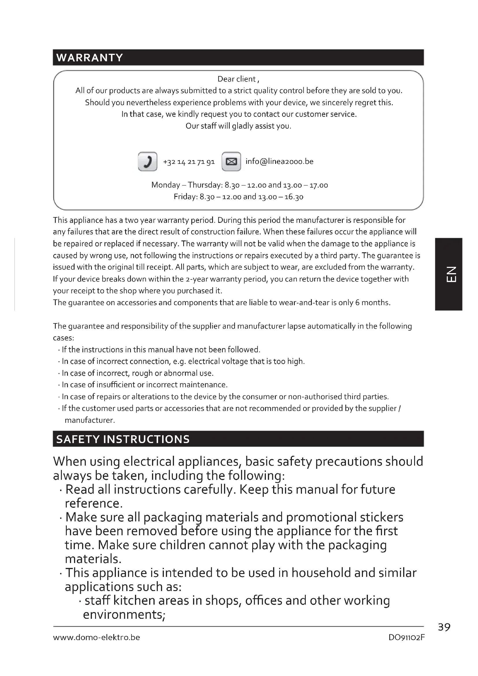 WARRANTY Dear client , All of our products are always submitted to a strict quality control before they are sold to you. Should you nevertheless experience problems with your device, we sincerely regret this. In that case, we kindly request you to contact our customer service. Our sta will gladly assist you. +32 14 21 71 91 info@linea2000.be Monday – Thursday: 8.30 – 12.00 and 13.00 – 17.00 Friday: 8.30 – 12.00 and 13.00 – 16.30 This appliance has a two year warranty period. During this period the manufacturer is responsible for any failures that are the direct result of construction failure. When these failures occur the appliance will be repaired or replaced if necessary. The warranty will not be valid when the damage to the appliance is caused by wrong use, not following the instructions or repairs executed by a third party. The guarantee is issued with the original till receipt. All parts, which are subject to wear, are excluded from the warranty. If your device breaks down within the 2-year warranty period, you can return the device together with your receipt to the shop where you purchased it. The guarantee on accessories and components that are liable to wear-and-tear is only 6 months. The guarantee and responsibility of the supplier and manufacturer lapse automatically in the following cases:
