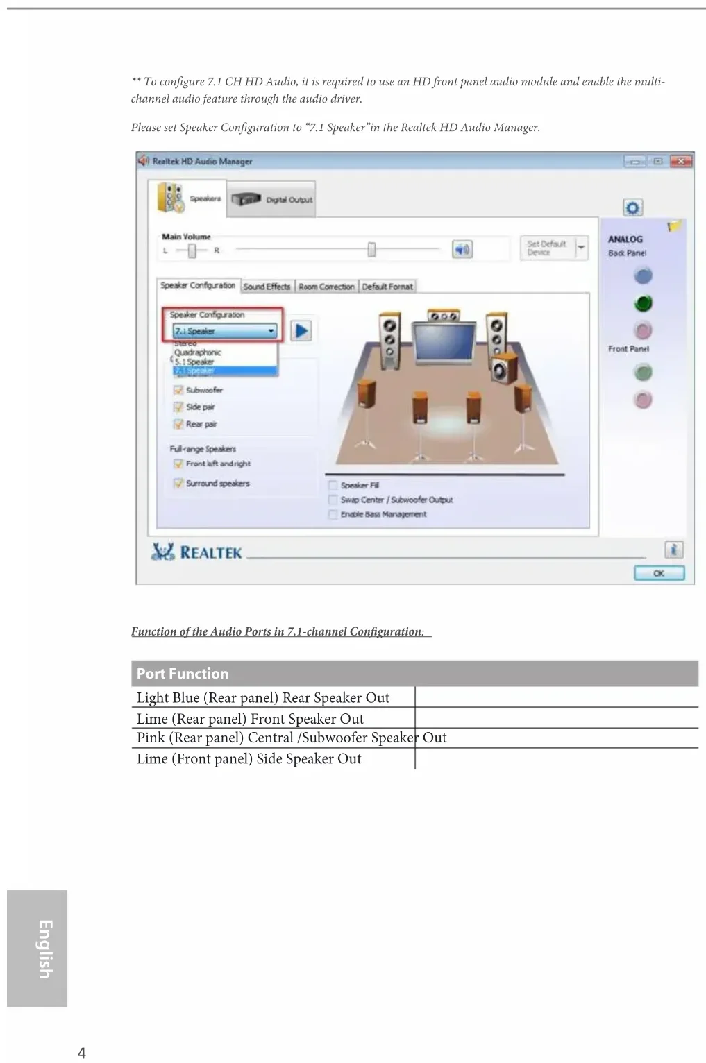 ** To congure 7.1 CH HD Audio, it is required to use an HD front panel audio module and enable the multi- channel audio feature through the audio driver. Please set Speaker Conguration to “7.1 Speaker”in the Realtek HD Audio Manager. Function of the Audio Ports in 7.1-channel Conguration: Port Function Light Blue (Rear panel) Rear Speaker Out Lime (Rear panel) Front Speaker Out Pink (Rear panel) Central /Subwoofer Speaker Out Lime (Front panel) Side Speaker OutEnglish