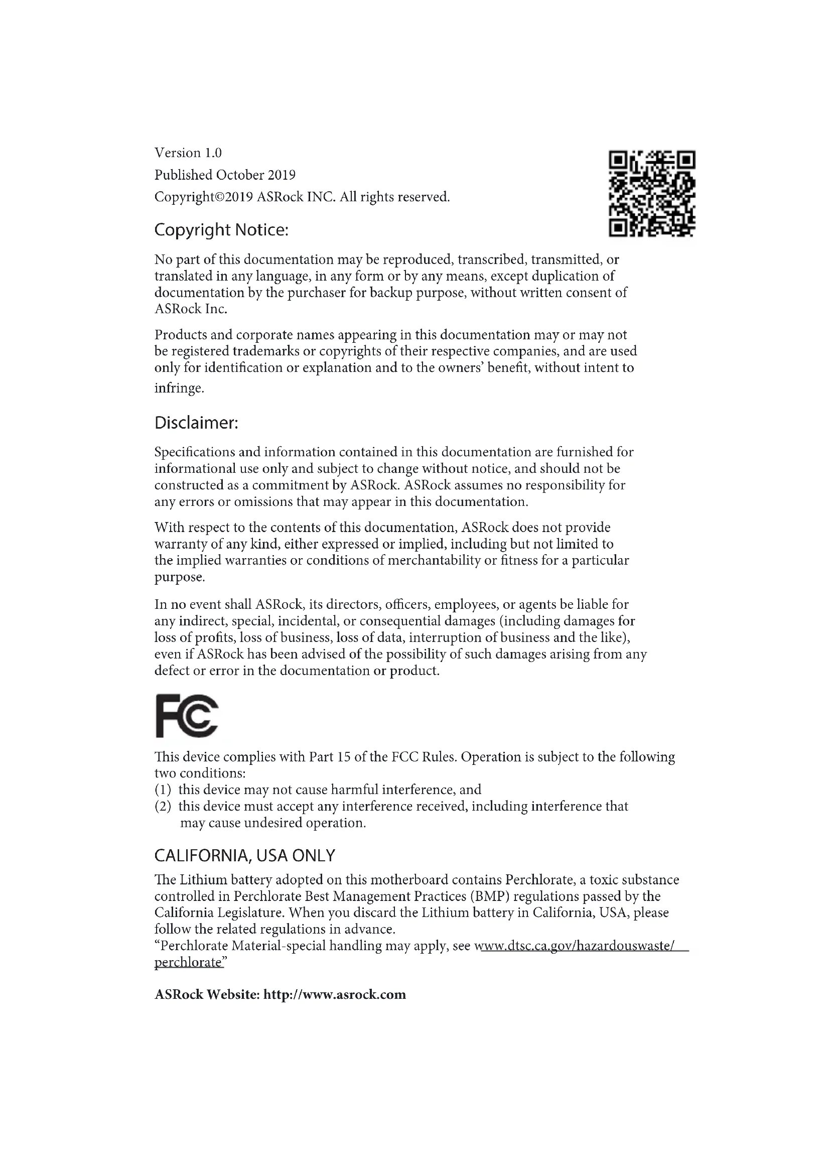 Version 1.0 Published October 2019 Copyright©2019 ASRock INC. All rights reserved. Copyright Notice: No part of this documentation may be reproduced, transcribed, transmitted, or translated in any language, in any form or by any means, except duplication of documentation by the purchaser for backup purpose, without written consent of ASRock Inc. Products and corporate names appearing in this documentation may or may not be registered trademarks or copyrights of their respective companies, and are used only for identication or explanation and to the owners’ benet, without intent to infringe. Disclaimer: Specications and information contained in this documentation are furnished for informational use only and subject to change without notice, and should not be constructed as a commitment by ASRock. ASRock assumes no responsibility for any errors or omissions that may appear in this documentation. With respect to the contents of this documentation, ASRock does not provide warranty of any kind, either expressed or implied, including but not limited to the implied warranties or conditions of merchantability or tness for a particular purpose. In no event shall ASRock, its directors, ocers, employees, or agents be liable for any indirect, special, incidental, or consequential damages (including damages for loss of prots, loss of business, loss of data, interruption of business and the like), even if ASRock has been advised of the possibility of such damages arising from any defect or error in the documentation or product. is device complies with Part 15 of the FCC Rules. Operation is subject to the following two conditions: (1) this device may not cause harmful interference, and (2) this device must accept any interference received, including interference that may cause undesired operation.