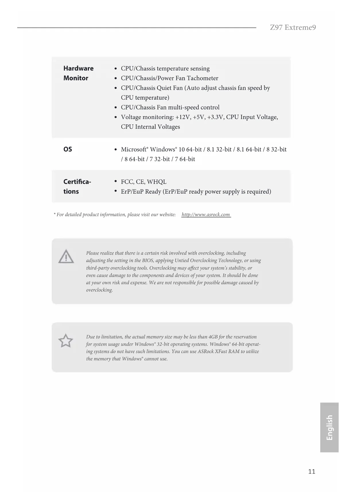 - For detailed product information, please visit our website: http://www.asrock.com Due to limitation, the actual memory size may be less than 4GB for the reservation for system usage under Windows® 32-bit operating systems. Windows® 64-bit operat- ing systems do not have such limitations. You can use ASRock XFast RAM to utilize the memory that Windows® cannot use.12 English is is an ATX form factor motherboard. Before you install the motherboard, study the conguration of your chassis to ensure that the motherboard ts into it. Pre-installation Precautions Take note of the following precautions before you install motherboard components or change any motherboard settings.