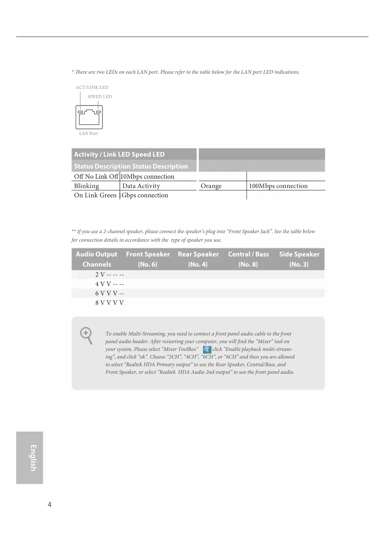 - ere are two LEDs on each LAN port. Please refer to the table below for the LAN port LED indications. Activity / Link LED Speed LED Status Description Status Description Of No Link Of 10Mbps connection Blinking Data Activity Orange 100Mbps connection On Link Green 1Gbps connection ** If you use a 2-channel speaker, please connect the speaker’s plug into “Front Speaker Jack”. See the table below for connection details in accordance with the type of speaker you use. Audio Output Channels Front Speaker (No. 6) Rear Speaker (No. 4) Central / Bass (No. 8) Side Speaker (No. 3) 2 V -- -- -- 4 V V -- -- 6 V V V -- 8 V V V V To enable Multi-Streaming, you need to connect a front panel audio cable to the front panel audio header. Aer restarting your computer, you will nd the “Mixer” tool on your system. Please select “Mixer ToolBox” , click “Enable playback multi-stream- ing”, and click “ok”. Choose “2CH”, “4CH”, “6CH”, or “8CH” and then you are allowed to select “Realtek HDA Primary output” to use the Rear Speaker, Central/Bass, and Front Speaker, or select “Realtek HDA Audio 2nd output” to use the front panel audio.