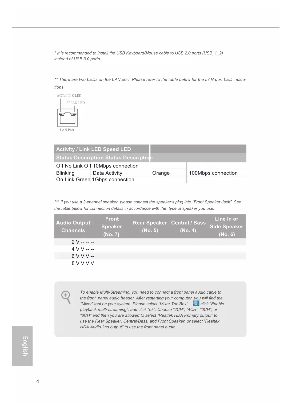- It is recommended to install the USB Keyboard/Mouse cable to USB 2.0 ports (USB_1_2) instead of USB 3.0 ports. ** There are two LEDs on the LAN port. Please refer to the table below for the LAN port LED indica- tions. Activity / Link LED Speed LED Status Description Status Description Off No Link Off 10Mbps connection Blinking Data Activity Orange 100Mbps connection On Link Green 1Gbps connection *** If you use a 2-channel speaker, please connect the speaker’s plug into “Front Speaker Jack”. See the table below for connection details in accordance with the type of speaker you use. Audio Output Channels Front Speaker (No. 7) Rear Speaker (No. 5) Central / Bass (No. 4) Line In or Side Speaker (No. 6) 2 V -- -- -- 4 V V -- -- 6 V V V -- 8 V V V V