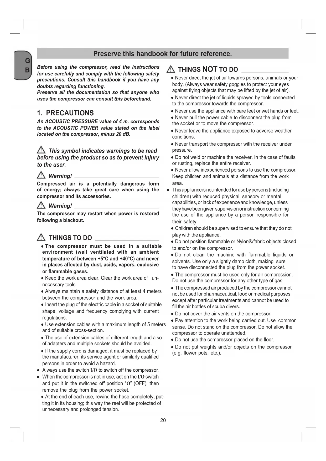 An ACOUSTIC PRESSURE value of 4 m. corresponds to the ACOUSTIC POWER value stated on the label located on the compressor, minus 20 dB. This symbol indicates warnings to be read before using the product so as to prevent injury to the user. Warning! Compressed air is a potentially dangerous form of energy; always take great care when using the compressor and its accessories. Warning! The compressor may restart when power is restored following a blackout.