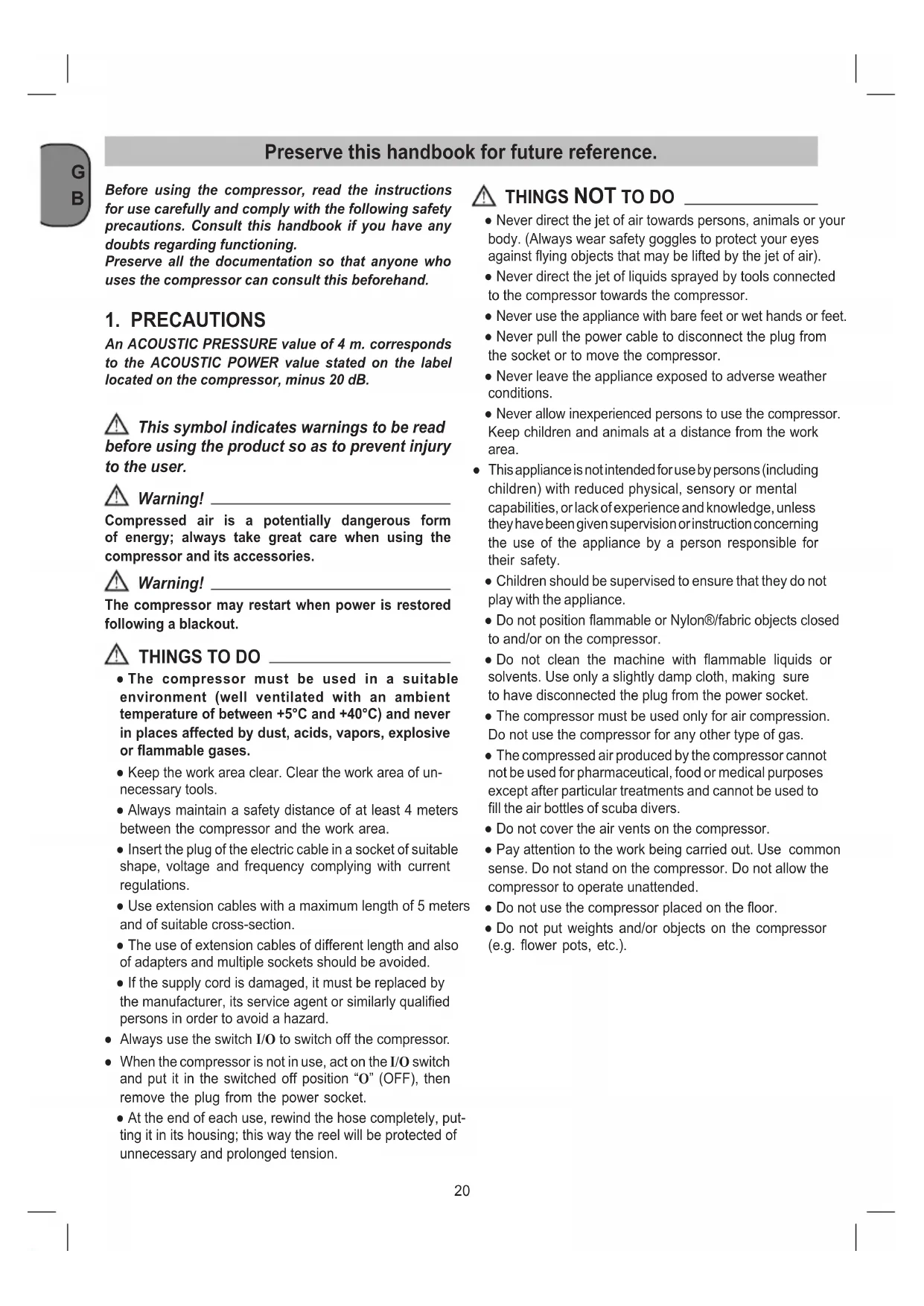 An ACOUSTIC PRESSURE value of 4 m. corresponds to the ACOUSTIC POWER value stated on the label located on the compressor, minus 20 dB. This symbol indicates warnings to be read before using the product so as to prevent injury to the user. Warning! Compressed air is a potentially dangerous form of energy; always take great care when using the compressor and its accessories. Warning! The compressor may restart when power is restored following a blackout.