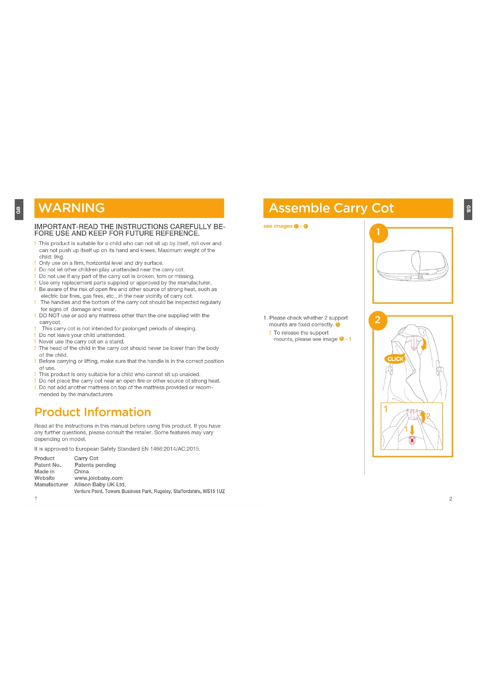 WARNING IMPORTANT-READ THE INSTRUCTIONS CAREFULLY BE-FORE USE AND KEEP FOR FUTURE REFERENCE.! This product is suitable for a child who can not sit up by itself, roll over and can not push up itself up on its hand and knees. Maximum weight of the child: 9kg.! Only use on a firm, horizontal level and dry surface.! Do not let other children play unattended near the carry cot.! Do not use if any part of the carry cot is broken, torn or missing.! Use only replacement parts supplied or approved by the manufacturer.! Be aware of the risk of open fire and other source of strong heat, such as electric bar fires, gas fires, etc., in the near vicinity of carry cot.! The handles and the bottom of the carry cot should be inspected regularly for signs of damage and wear.! DO NOT use or add any mattress other than the one supplied with the carry cot.! This carry cot is not intended for prolonged periods of sleeping.! Do not leave your child unattended.! Never use the carry cot on a stand.! The head of the child in the carry cot should never be lower than the body of the child. ! Before carrying or lifting, make sure that the handle is in the correct position of use.! This product is only suitable for a child who cannot sit up unaided.! Do not place the carry cot near an open fire or other source of strong heat.! Do not add another mattress on top of the mattress provided or recom-mended by the manufacturers Product Information Read all the instructions in this manual before using this product. If you have any further questions, please consult the retailer. Some features may vary depending on model.It is approved to European Safety Standard EN 1466:2014/AC:2015. Product Carry CotPatent No. Patents pendingMade in ChinaWebsite www.joiebaby.comManufacturer Allison Baby UK Ltd, Venture Point, Towers Business Park, Rugeley, Staffordshire, WS15 1UZ Assemble Carry Cot