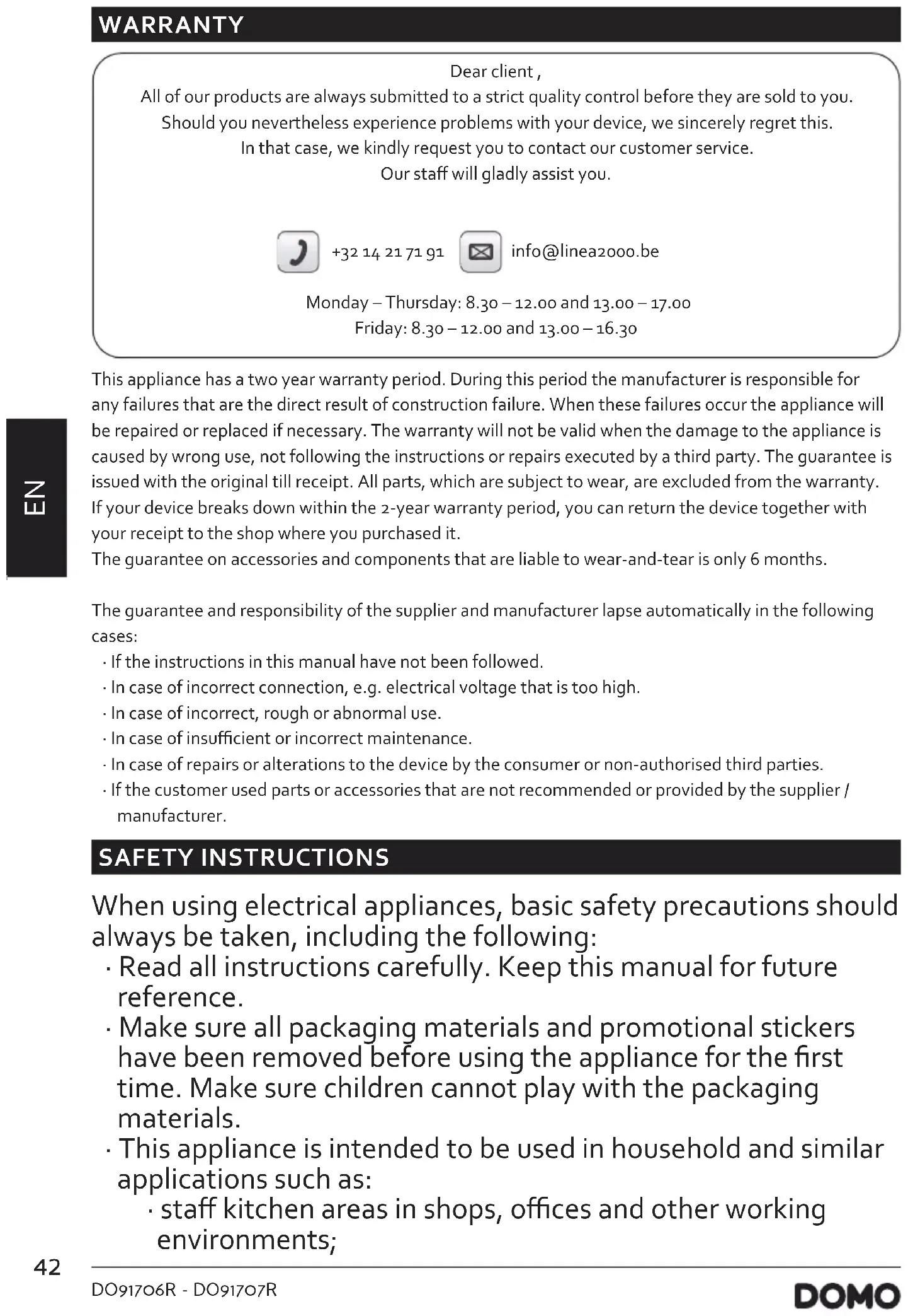 WARRANTY Dear client , All of our products are always submitted to a strict quality control before they are sold to you. Should you nevertheless experience problems with your device, we sincerely regret this. In that case, we kindly request you to contact our customer service. Our sta will gladly assist you. +32 14 21 71 91 info@linea2000.be Monday – Thursday: 8.30 – 12.00 and 13.00 – 17.00 Friday: 8.30 – 12.00 and 13.00 – 16.30 This appliance has a two year warranty period. During this period the manufacturer is responsible for any failures that are the direct result of construction failure. When these failures occur the appliance will be repaired or replaced if necessary. The warranty will not be valid when the damage to the appliance is caused by wrong use, not following the instructions or repairs executed by a third party. The guarantee is issued with the original till receipt. All parts, which are subject to wear, are excluded from the warranty. If your device breaks down within the 2-year warranty period, you can return the device together with your receipt to the shop where you purchased it. The guarantee on accessories and components that are liable to wear-and-tear is only 6 months. The guarantee and responsibility of the supplier and manufacturer lapse automatically in the following cases: