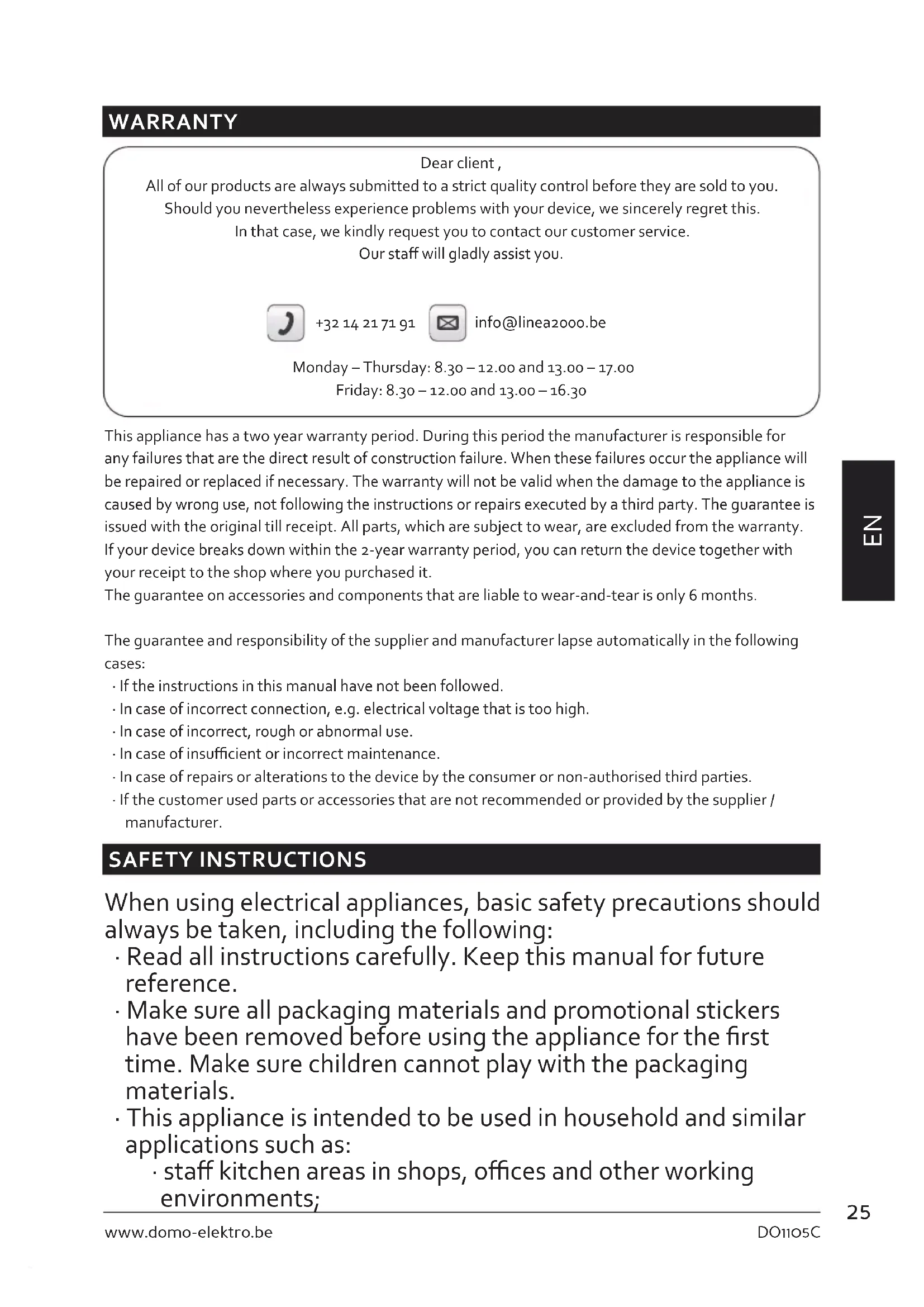 WARRANTY Dear client , All of our products are always submitted to a strict quality control before they are sold to you. Should you nevertheless experience problems with your device, we sincerely regret this. In that case, we kindly request you to contact our customer service. Our sta will gladly assist you. +32 14 21 71 91 info@linea2000.be Monday – Thursday: 8.30 – 12.00 and 13.00 – 17.00 Friday: 8.30 – 12.00 and 13.00 – 16.30 This appliance has a two year warranty period. During this period the manufacturer is responsible for any failures that are the direct result of construction failure. When these failures occur the appliance will be repaired or replaced if necessary. The warranty will not be valid when the damage to the appliance is caused by wrong use, not following the instructions or repairs executed by a third party. The guarantee is issued with the original till receipt. All parts, which are subject to wear, are excluded from the warranty. If your device breaks down within the 2-year warranty period, you can return the device together with your receipt to the shop where you purchased it. The guarantee on accessories and components that are liable to wear-and-tear is only 6 months. The guarantee and responsibility of the supplier and manufacturer lapse automatically in the following cases: