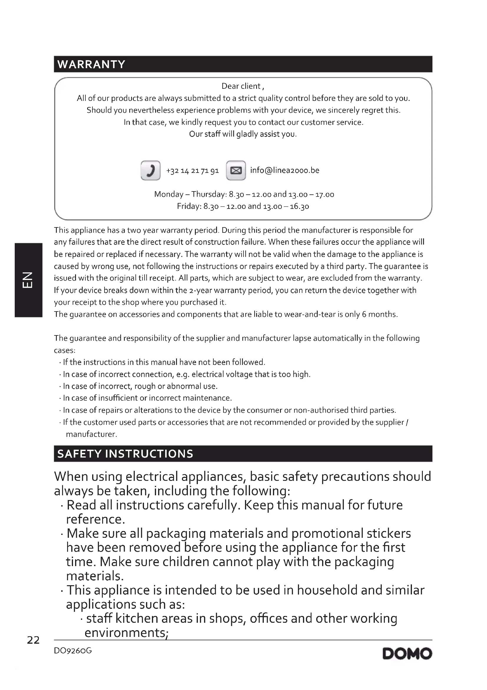 WARRANTY Dear client , All of our products are always submitted to a strict quality control before they are sold to you. Should you nevertheless experience problems with your device, we sincerely regret this. In that case, we kindly request you to contact our customer service. Our sta will gladly assist you. +32 14 21 71 91 info@linea2000.be Monday – Thursday: 8.30 – 12.00 and 13.00 – 17.00 Friday: 8.30 – 12.00 and 13.00 – 16.30 This appliance has a two year warranty period. During this period the manufacturer is responsible for any failures that are the direct result of construction failure. When these failures occur the appliance will be repaired or replaced if necessary. The warranty will not be valid when the damage to the appliance is caused by wrong use, not following the instructions or repairs executed by a third party. The guarantee is issued with the original till receipt. All parts, which are subject to wear, are excluded from the warranty. If your device breaks down within the 2-year warranty period, you can return the device together with your receipt to the shop where you purchased it. The guarantee on accessories and components that are liable to wear-and-tear is only 6 months. The guarantee and responsibility of the supplier and manufacturer lapse automatically in the following cases: