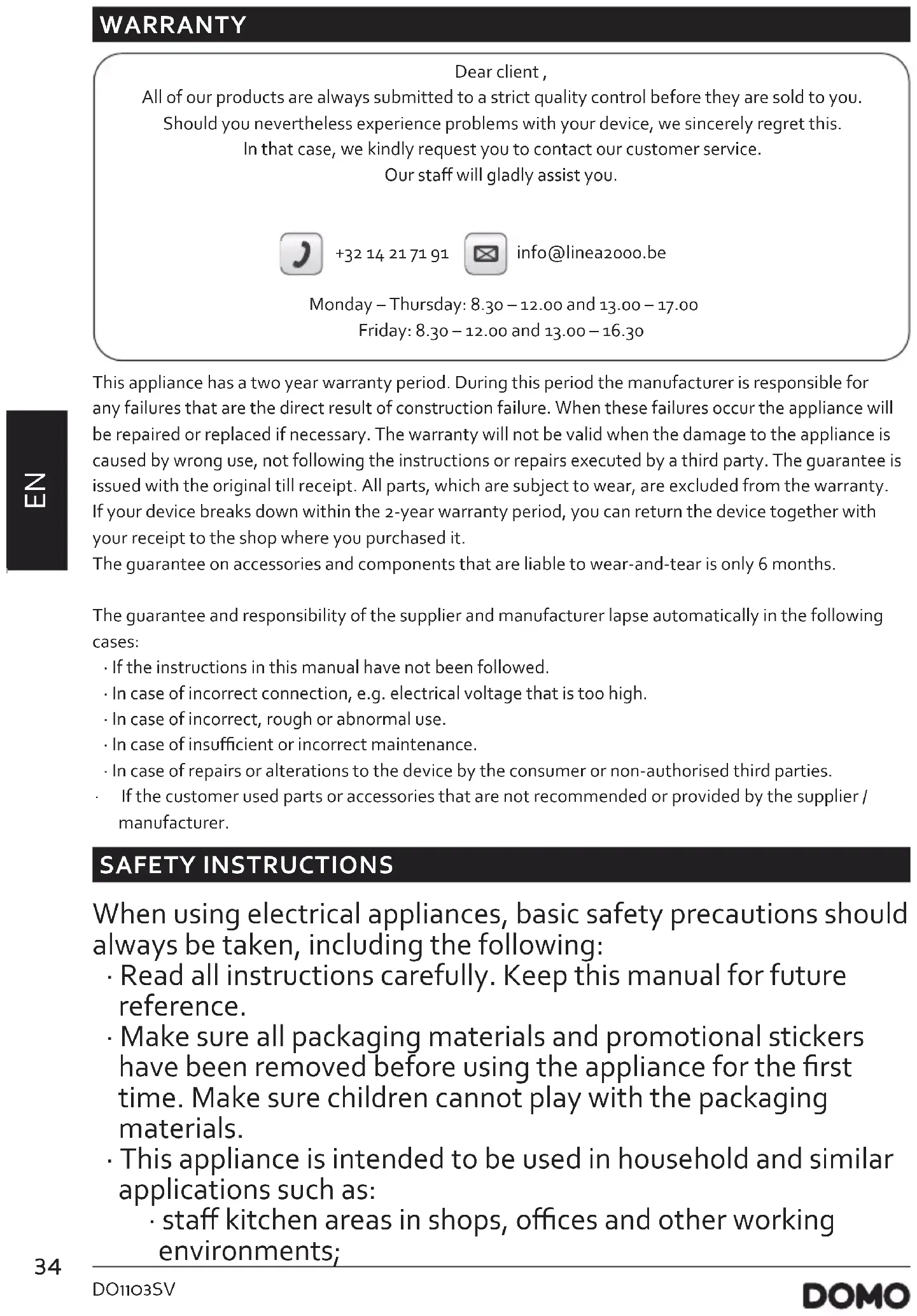 WARRANTY Dear client , All of our products are always submitted to a strict quality control before they are sold to you. Should you nevertheless experience problems with your device, we sincerely regret this. In that case, we kindly request you to contact our customer service. Our sta will gladly assist you. +32 14 21 71 91 info@linea2000.be Monday – Thursday: 8.30 – 12.00 and 13.00 – 17.00 Friday: 8.30 – 12.00 and 13.00 – 16.30 This appliance has a two year warranty period. During this period the manufacturer is responsible for any failures that are the direct result of construction failure. When these failures occur the appliance will be repaired or replaced if necessary. The warranty will not be valid when the damage to the appliance is caused by wrong use, not following the instructions or repairs executed by a third party. The guarantee is issued with the original till receipt. All parts, which are subject to wear, are excluded from the warranty. If your device breaks down within the 2-year warranty period, you can return the device together with your receipt to the shop where you purchased it. The guarantee on accessories and components that are liable to wear-and-tear is only 6 months. The guarantee and responsibility of the supplier and manufacturer lapse automatically in the following cases: