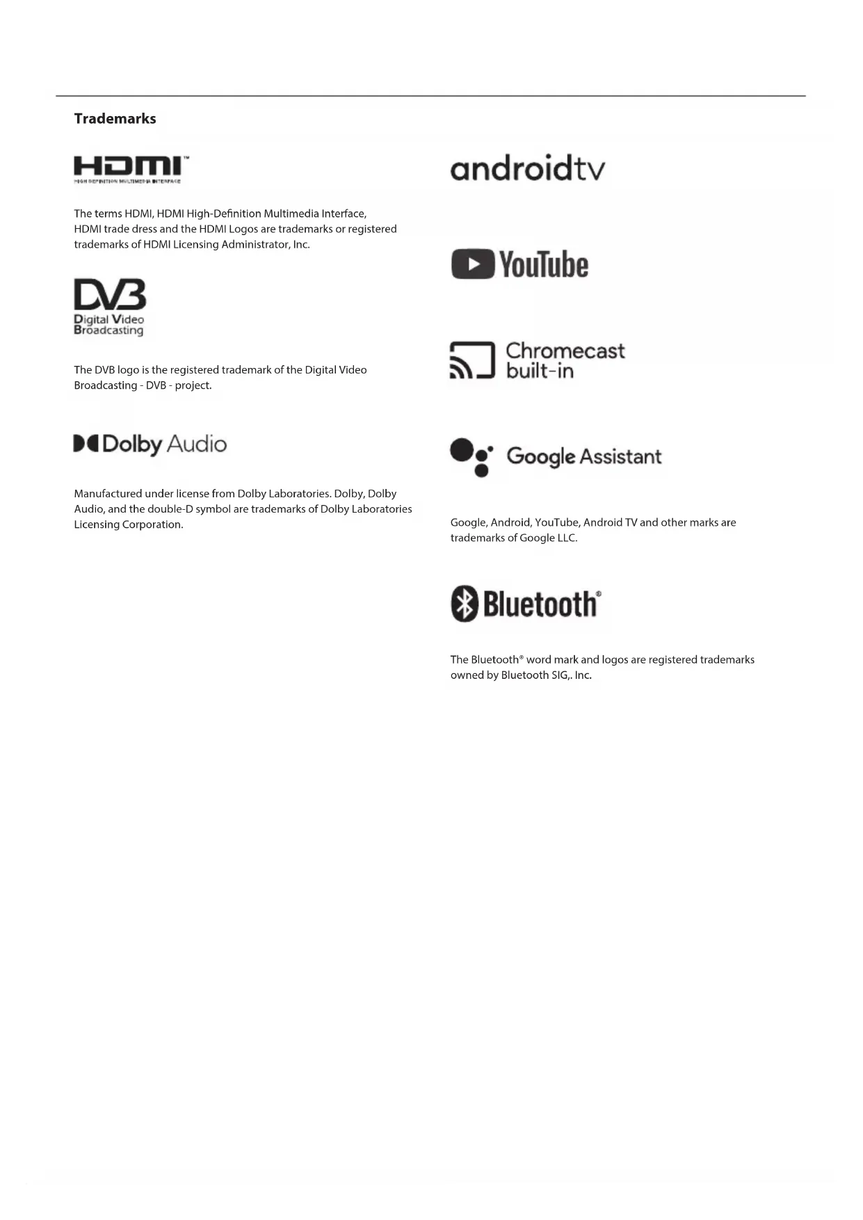 SR ELSL EN NLFRDE IT ES PTTrademarks The terms HDMI, HDMI High-Denition Multimedia Interface, HDMI trade dress and the HDMI Logos are trademarks or registered trademarks of HDMI Licensing Administrator, Inc. The DVB logo is the registered trademark of the Digital Video Broadcasting - DVB - project. Manufactured under license from Dolby Laboratories. Dolby, Dolby Audio, and the double-D symbol are trademarks of Dolby Laboratories Licensing Corporation. Google, Android, YouTube, Android TV and other marks are trademarks of Google LLC. The Bluetooth® word mark and logos are registered trademarks owned by Bluetooth SIG,. Inc.ENEN Important safety instructions CAUTION