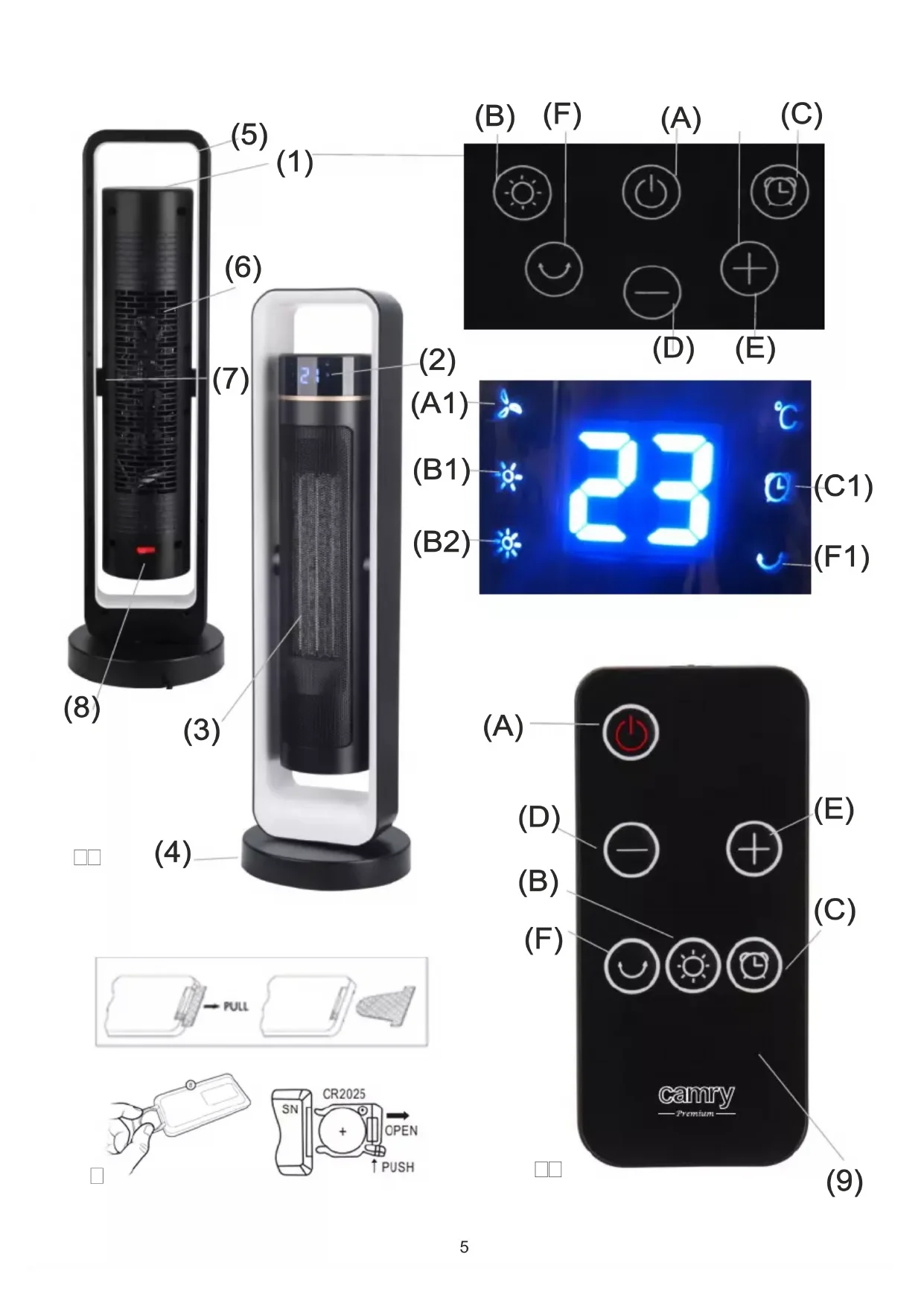 Control panel (1) / Remote control (9) buttons description: A. Standby mode button B. Heating level button C. Timer button D. Temperature decrease button E. Temperature increase button F. Oscillation button Display panel (2) icons description: A1. Cool air airflow icon B1. Warm air heating icon B1. + B2. Hot air heating icons C1. Timer icon F1. Oscillation function icon G. Temperature icon USAGE 1. Ensure the power switch (8) is off. Insert the plug into a suitable power outlet and turn the power supply on by pressing to position I the power switch (8) located at the back of the device. The device is in standby mode. 2. Press button (A) on the control panel (1) that will respond to your touch, and the LED display (2) shows the room temperature (G). The cool air is flowing and fan icon (A1) is shown too.