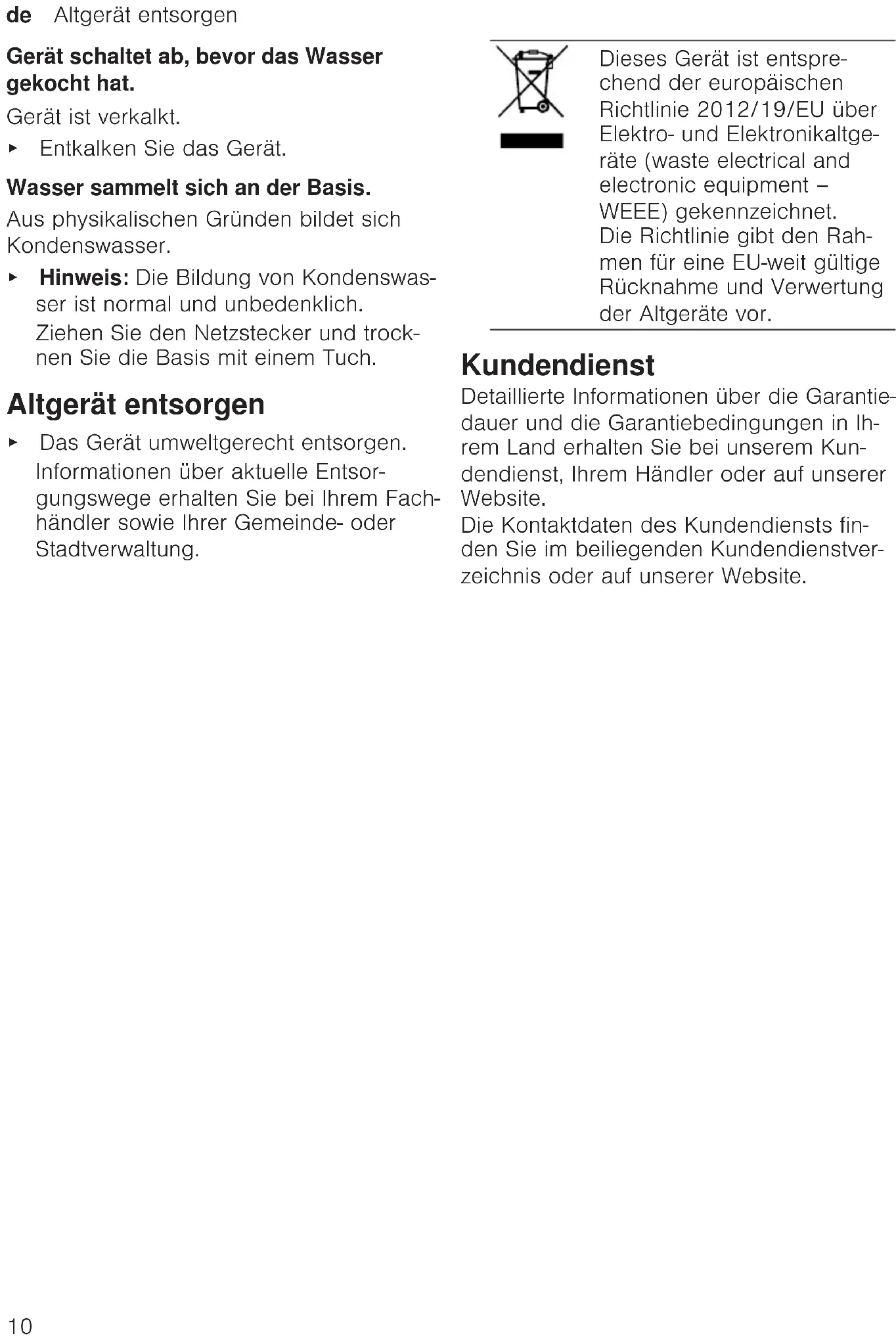 - Fig. 13 Troubleshooting The appliance does not heat up and the on/off switch does not light up. Overheating protection is active. ▶ Leave the appliance to cool down for a long time before switching it on again. The appliance switches off before the water has boiled. Build-up of limescale in the appliance. ▶ Descale the appliance. Water collects at the base. Condensation may form for reasons of physics. ▶ Note:The formation of condensation is normal and harmless. Pull out the mains plug and dry the base with a cloth. Disposing of old appliance ▶ Dispose of the appliance in an environ- mentally friendly manner.en Customer Service