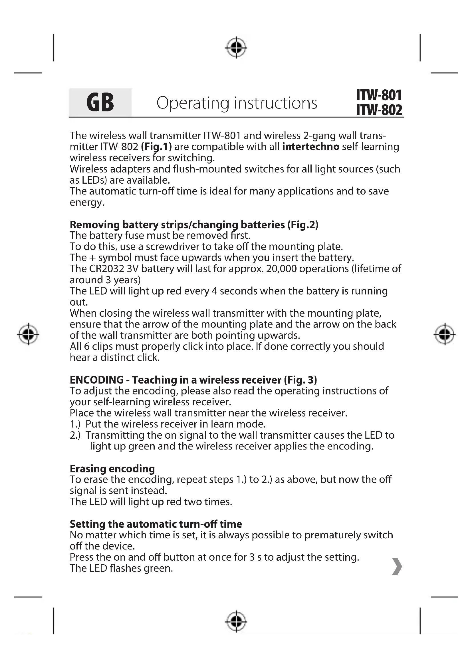 ITW-801 ITW-802The on button extends the turn-off time; the off button reduces it. The green LED displays: 0 – 1x lighting up of the LED 5 s – 2x 1 min. – 3x 10 min. – 4x 30 min. – 5x 60 min. – 6x Pressing the on and off button at the same time again for 3 s saves the turn-off time. The LED briefly flashes to confirm this. ITW-802: Each channel can be assigned its own turn-off time. This means that two receivers can turn off at different times. However, it is also possible for a receiver that has learned both codes to be assigned a short or long turn-off time (for example, button 1 = 10 min., button 2 = 60 min.). Mounting Easy to install mounting plate. The mounting plate is easy to affix on glass, wood, wallpaper or tiles, etc. Double-sided adhesive tape and screws are included. Caution: Avoid shielding through metal objects. Operation To turn on: Press on (top) once. The LED will briefly light up green. To turn off: Press off (bottom) once. The LED will briefly light up red two times. Dimming: 1.) Start the dimming cycle by pressing the on signal again and stop the dimming or brightening at the desired brightness with the on signal.